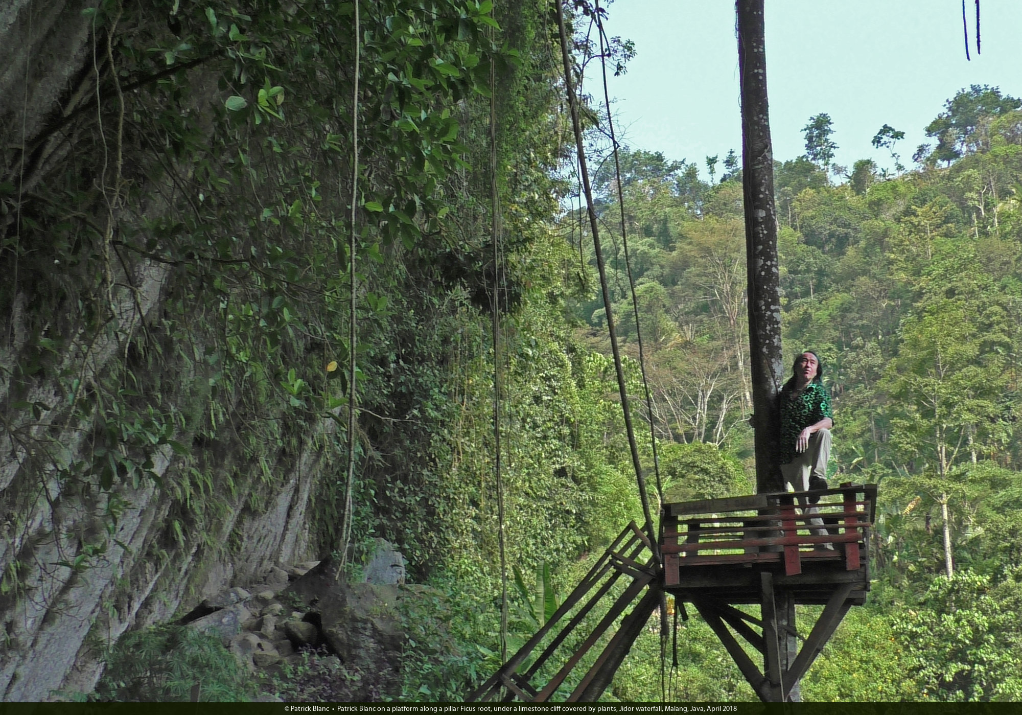 Patrick Blanc on a platform along a pillar Ficus root under a limestone cliff, Jidor waterfall, Malang, Java, April 2018