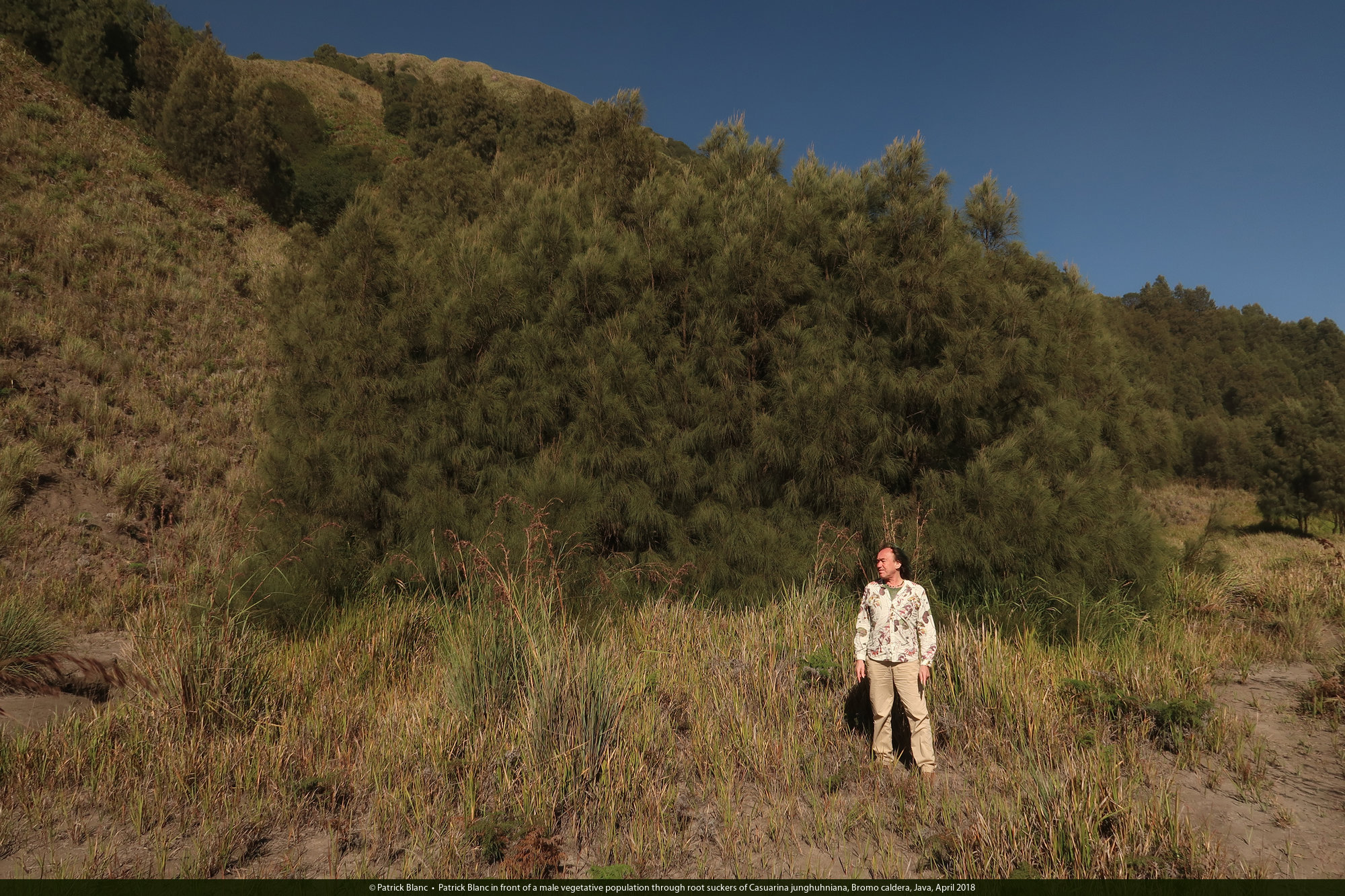 Patrick Blanc in front of a male vegetative population through root suckers of Casuarina junghuhniana, Bromo caldera, Java, April 2018