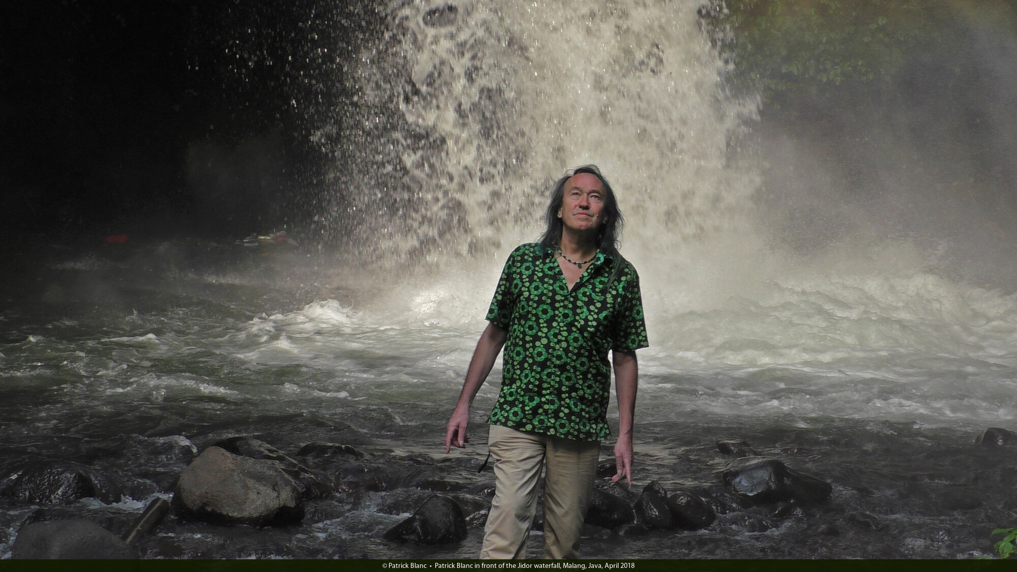 Patrick Blanc in front of the Jidor waterfall, Malang, Java, April 2018
