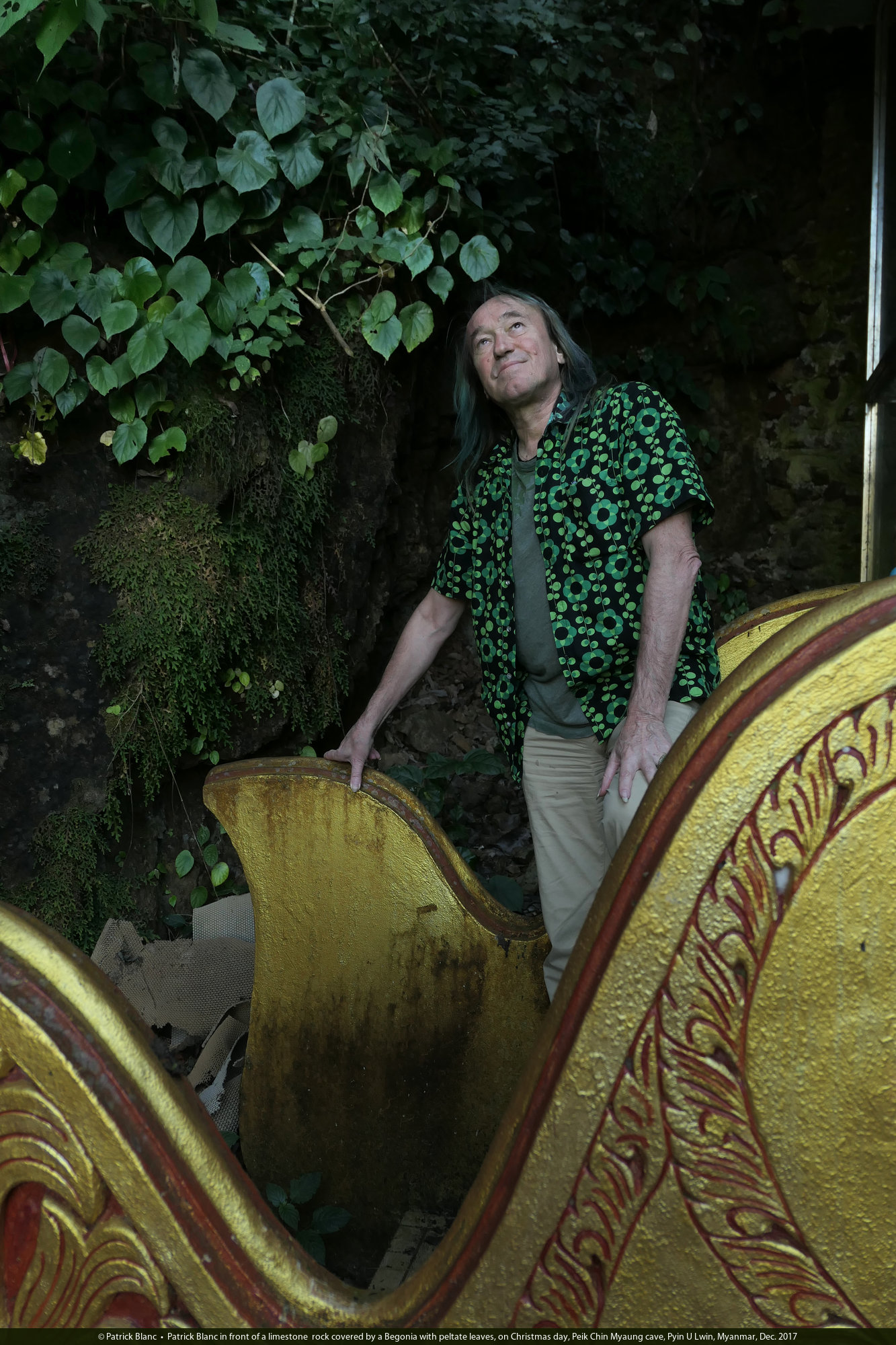 Patrick Blanc in front of a limestone rock covered by Begonia wui-senioris with peltate leaves, on Christmas day, Peik Chin Myaung cave, Pyin U Lwin, Myanmar, Dec. 2017