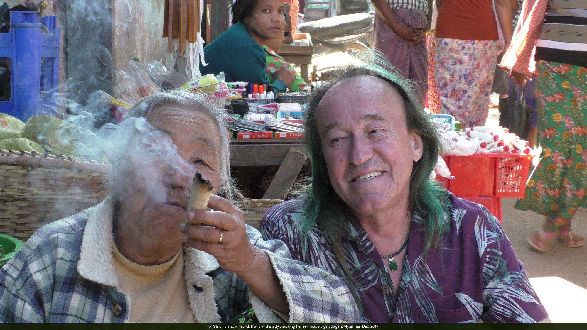 Patrick Blanc and a lady smoking her self made cigar, Bagan, Myanmar, Dec. 2017