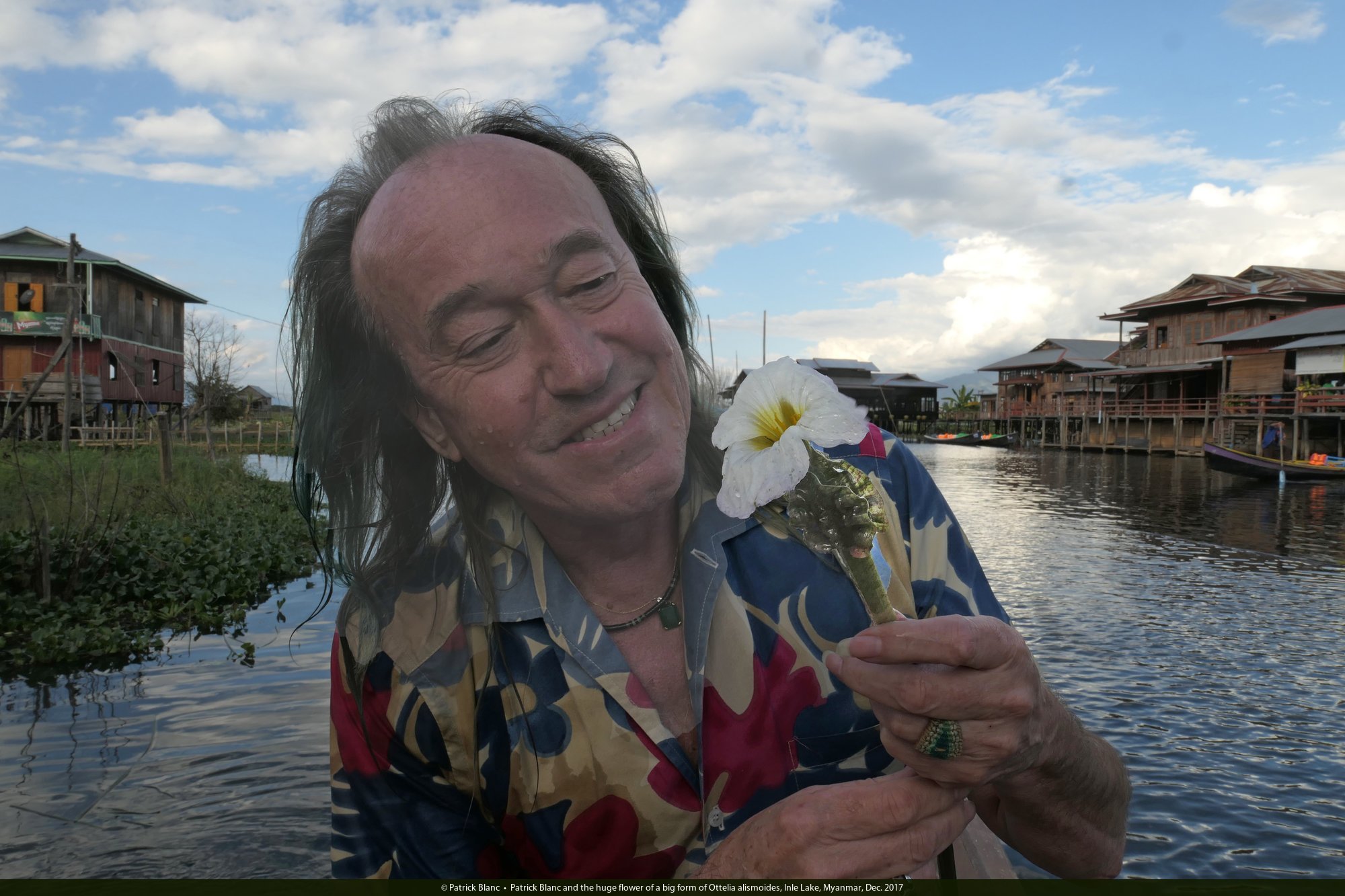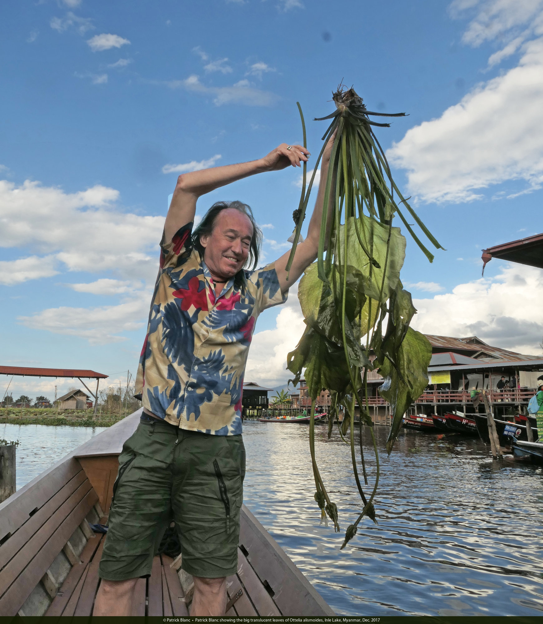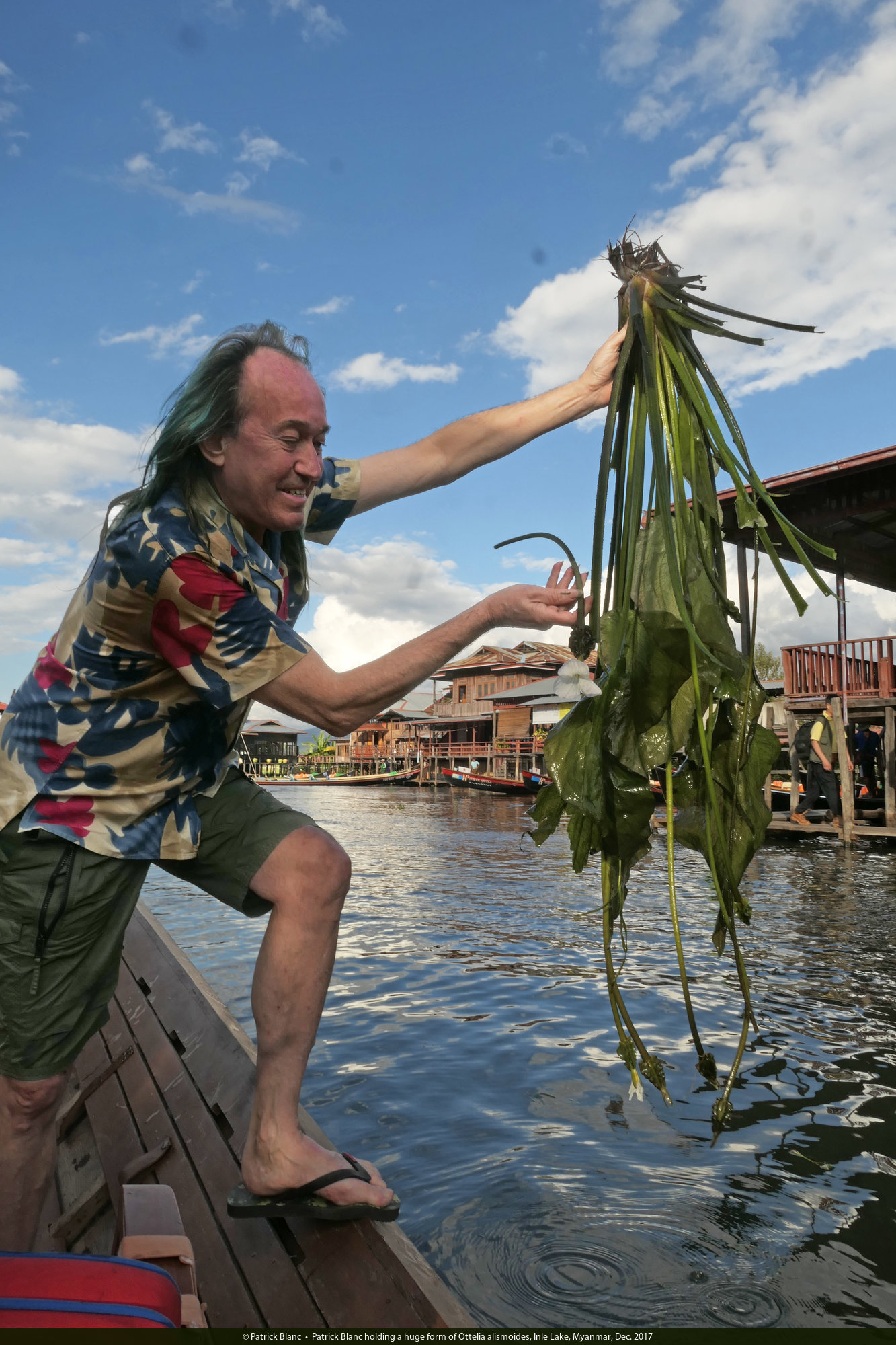 Patrick Blanc holding a huge form of Ottelia alismoides, Inle Lake, Myanmar, Dec. 2017