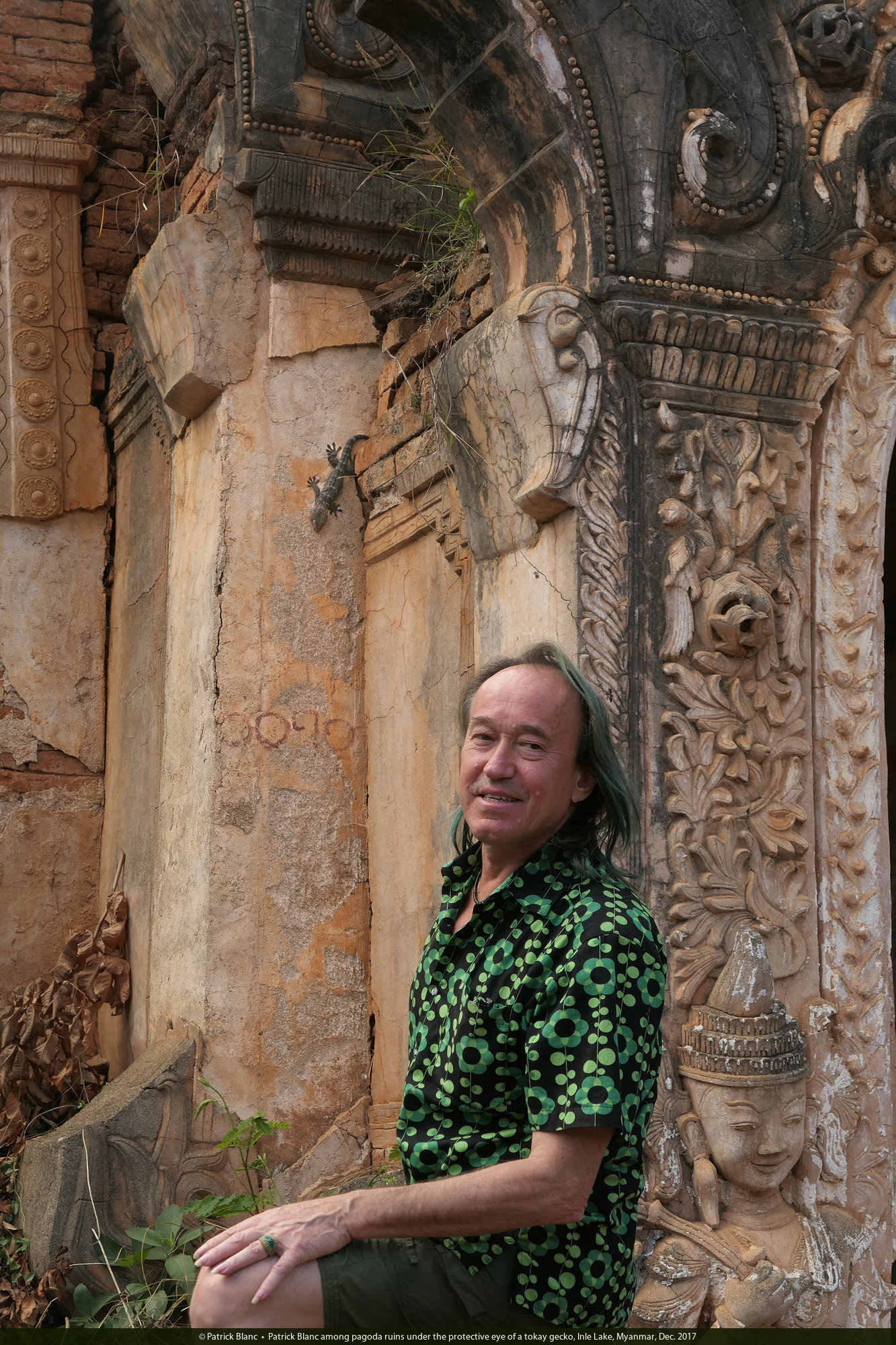 Patrick Blanc among pagoda ruins under the protective eye of a tokay gecko, Inle Lake, Myanmar, Dec. 2017