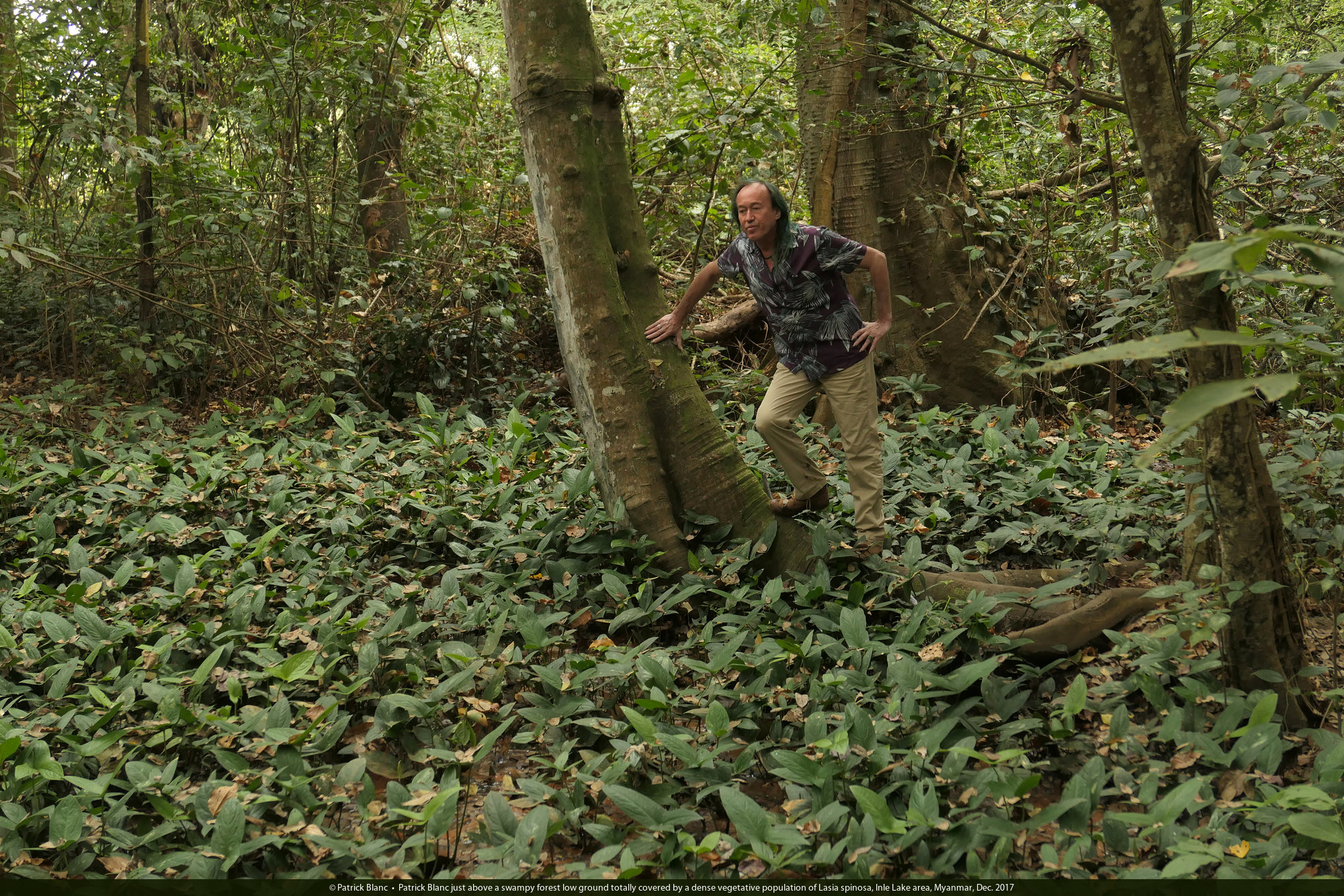 Patrick Blanc just above a swampy forest low ground totally covered by a dense vegetative population of Lasia spinosa, Inle Lake area, Myanmar, Dec. 2017