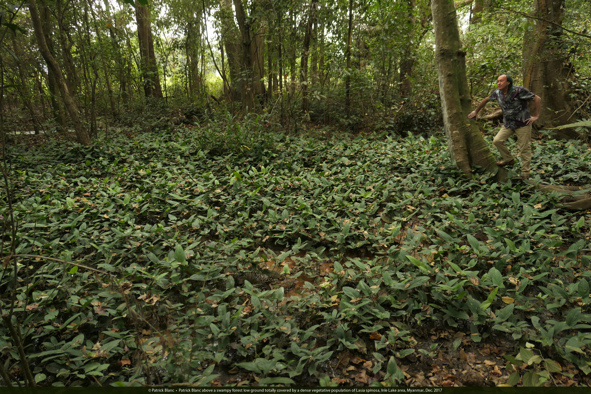 Patrick Blanc above a swampy forest low ground totally covered by a dense vegetative population of Lasia spinosa, Inle Lake area, Myanmar, Dec. 2017