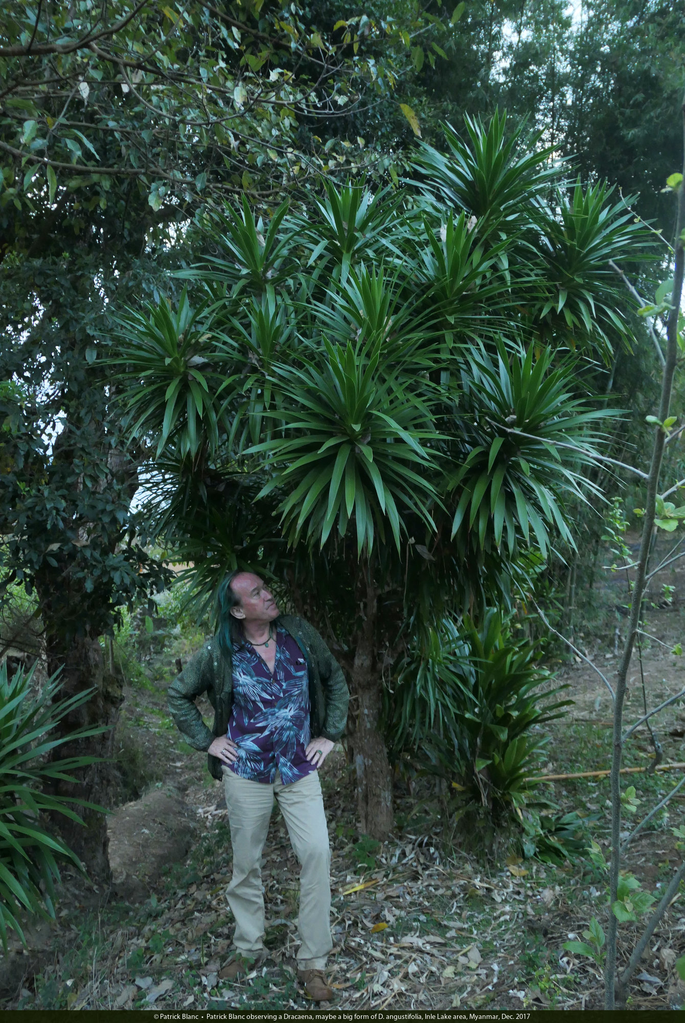 Patrick Blanc observing a Dracaena, maybe a big form of D. angustifolia, Inle Lake area, Myanmar, Dec. 2017