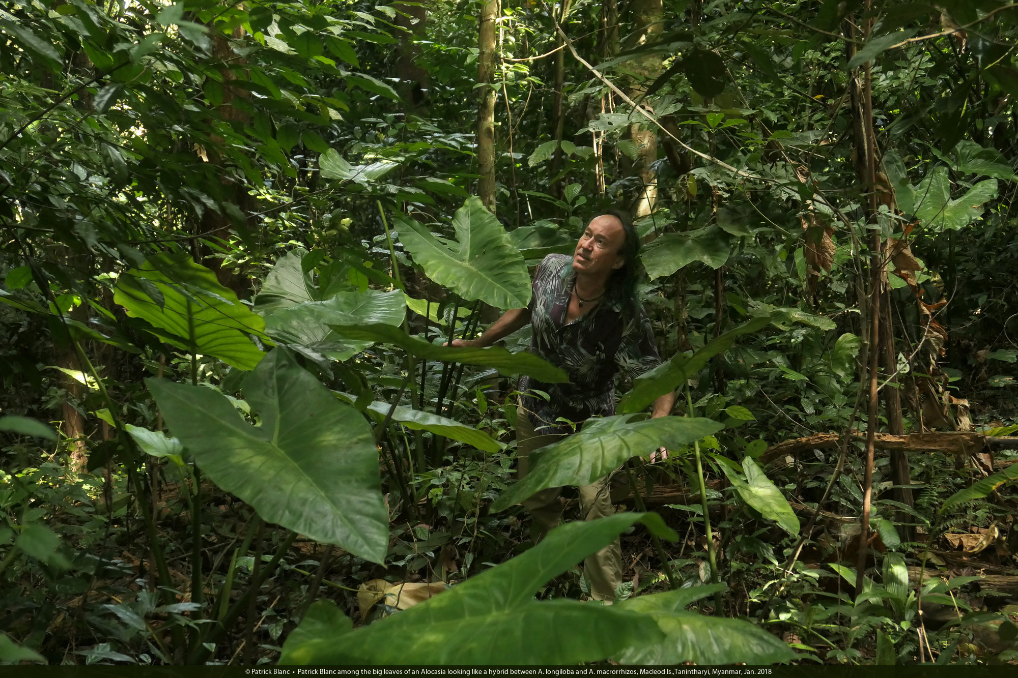 Patrick Blanc among the big leaves of an Alocasia looking like a hybrid between A. longiloba and A. macrorrhizos, Macleod Is.,Tanintharyi, Myanmar, Jan. 2018