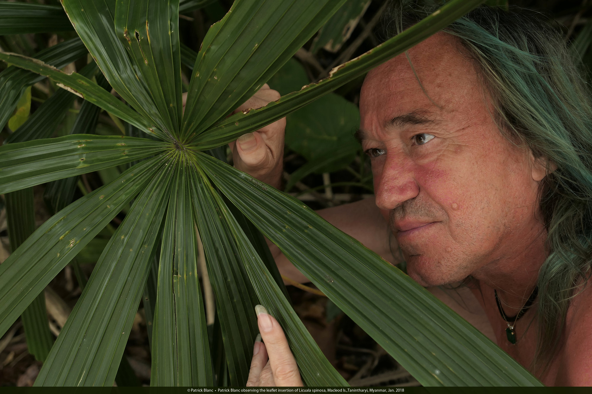 Patrick Blanc observing the leaflet insertion of Licuala spinosa, Macleod Is.,Tanintharyi, Myanmar, Jan. 2018