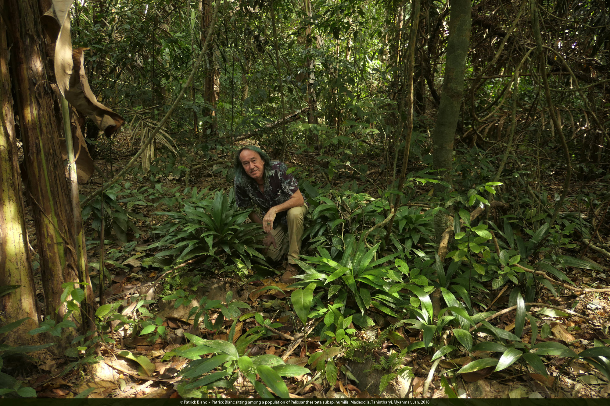 Patrick Blanc observing the bright blue sarcotesta coating the seeds of Peliosanthes teta subsp. humilis, an Angiosperm turning back to Gymnospermous stage, Macleod Is.,Tanintharyi, Myanmar, Jan. 2018