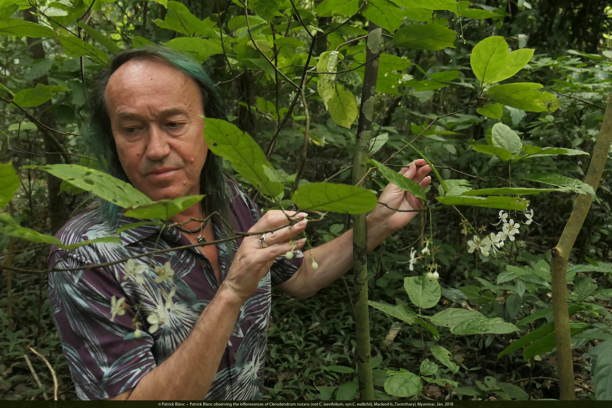 Patrick Blanc observing the infloresences of Clerodendrum nutans (not C. laevifolium, syn.C. wallichii), Macleod Is.,Tanintharyi, Myanmar, Jan. 2018
