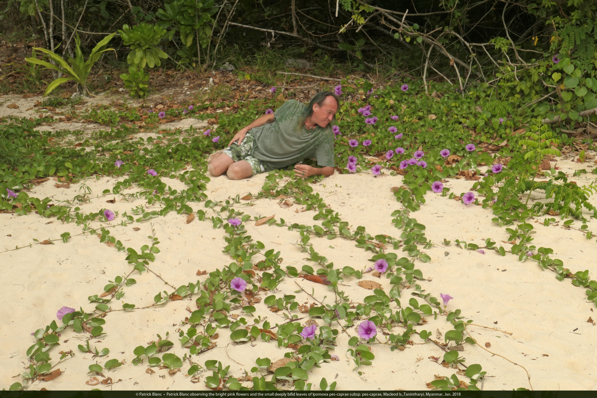 Patrick Blanc observing the bright pink flowers and the small deeply bifid leaves of Ipomoea pes-caprae subsp. pes-caprae, Macleod Is.,Tanintharyi, Myanmar, Jan. 2018