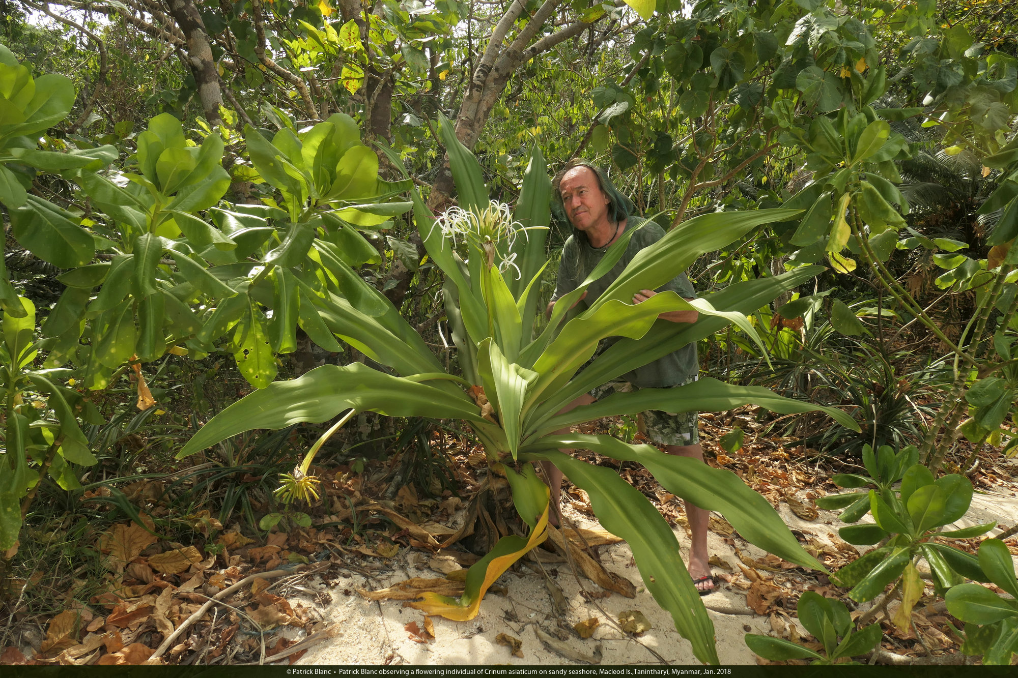 Patrick Blanc observing a flowering individual of Crinum asiaticum on sandy seashore, Macleod Is.,Tanintharyi, Myanmar, Jan. 2018