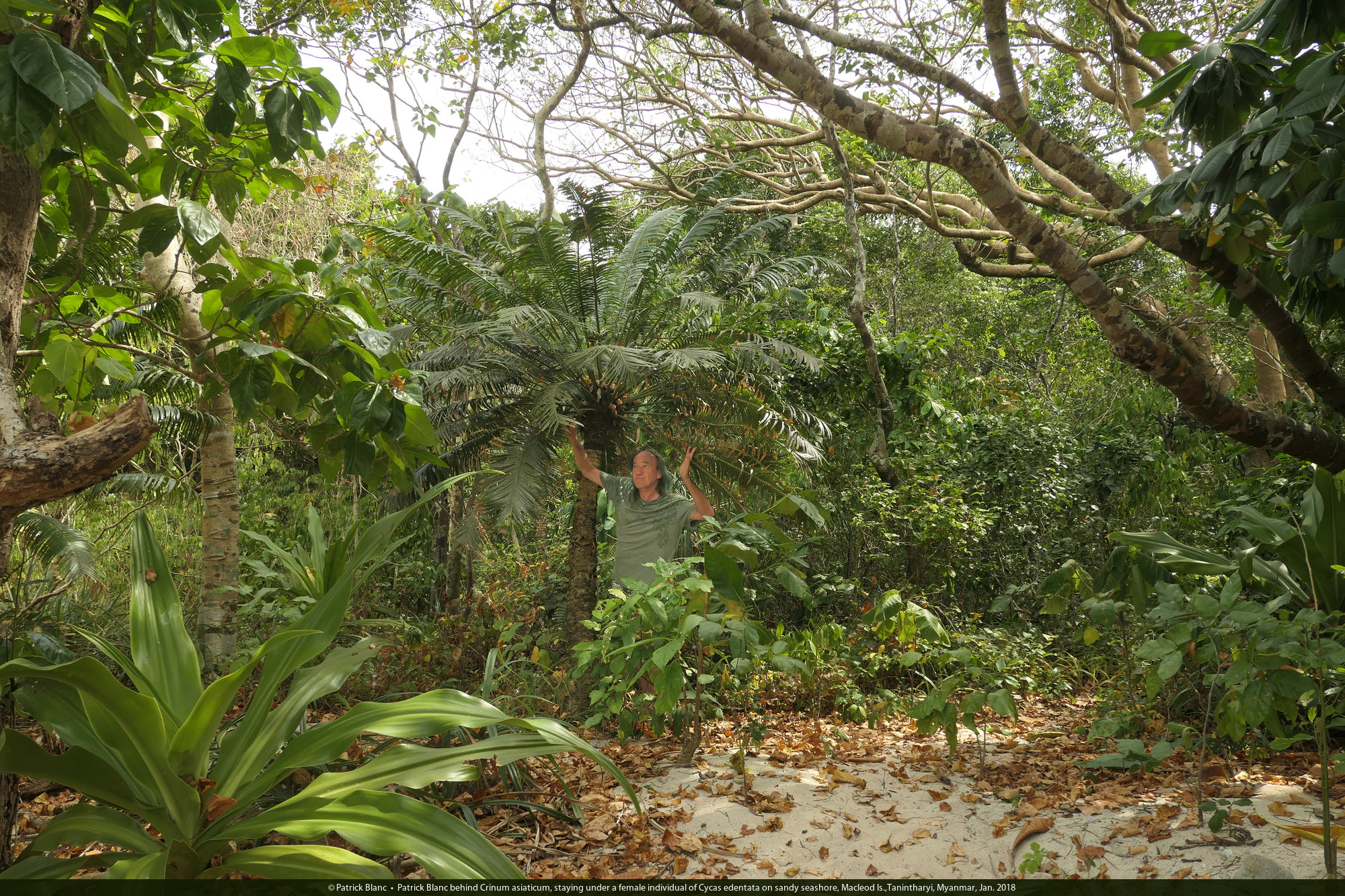 Patrick Blanc behind Crinum asiaticum, staying under a female individual of Cycas edentata on sandy seashore, Macleod Is.,Tanintharyi, Myanmar, Jan. 2018