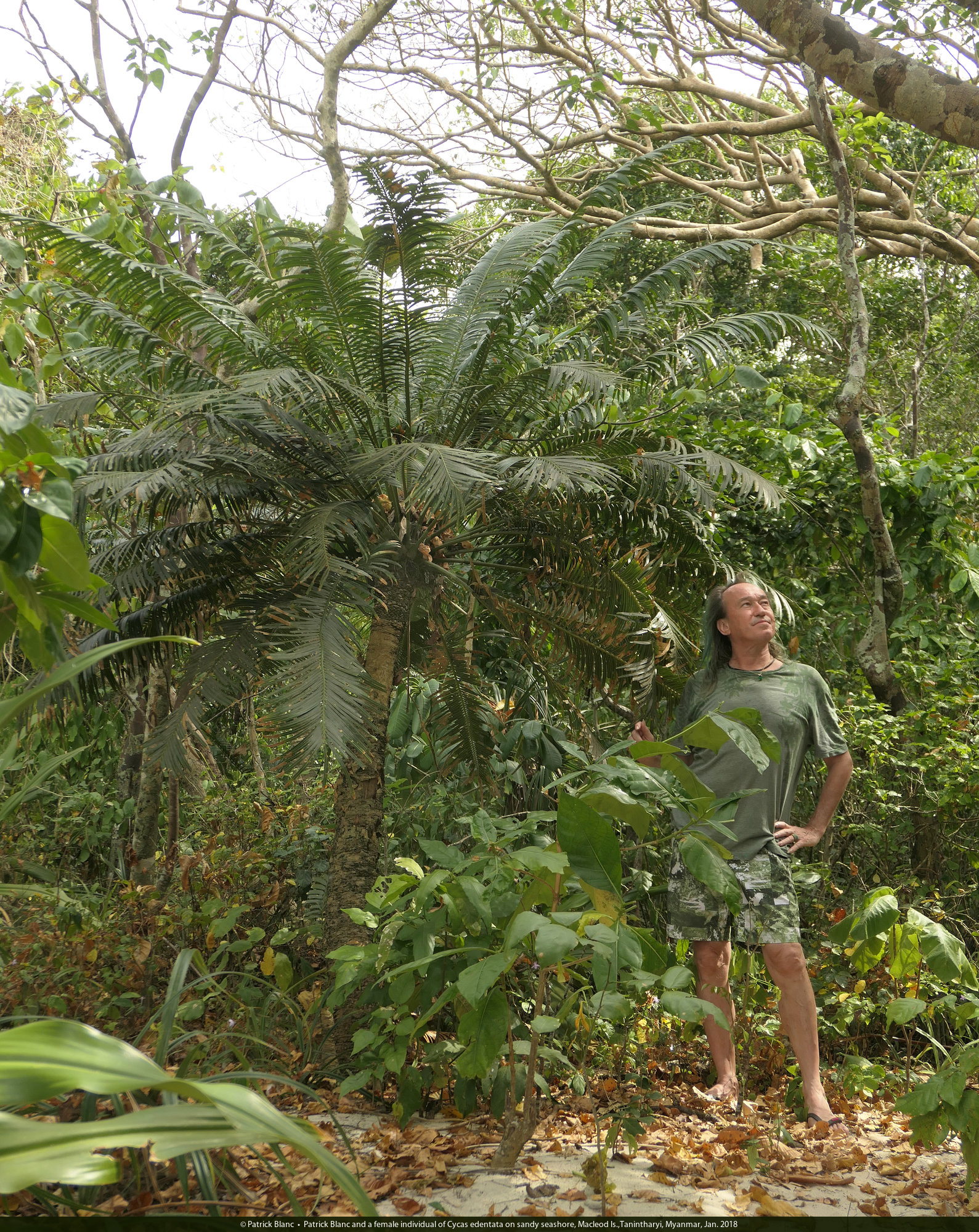 Patrick Blanc between two old individuals of Cycas edentata on sandy seashore, Macleod Is.,Tanintharyi, Myanmar, Jan. 2018