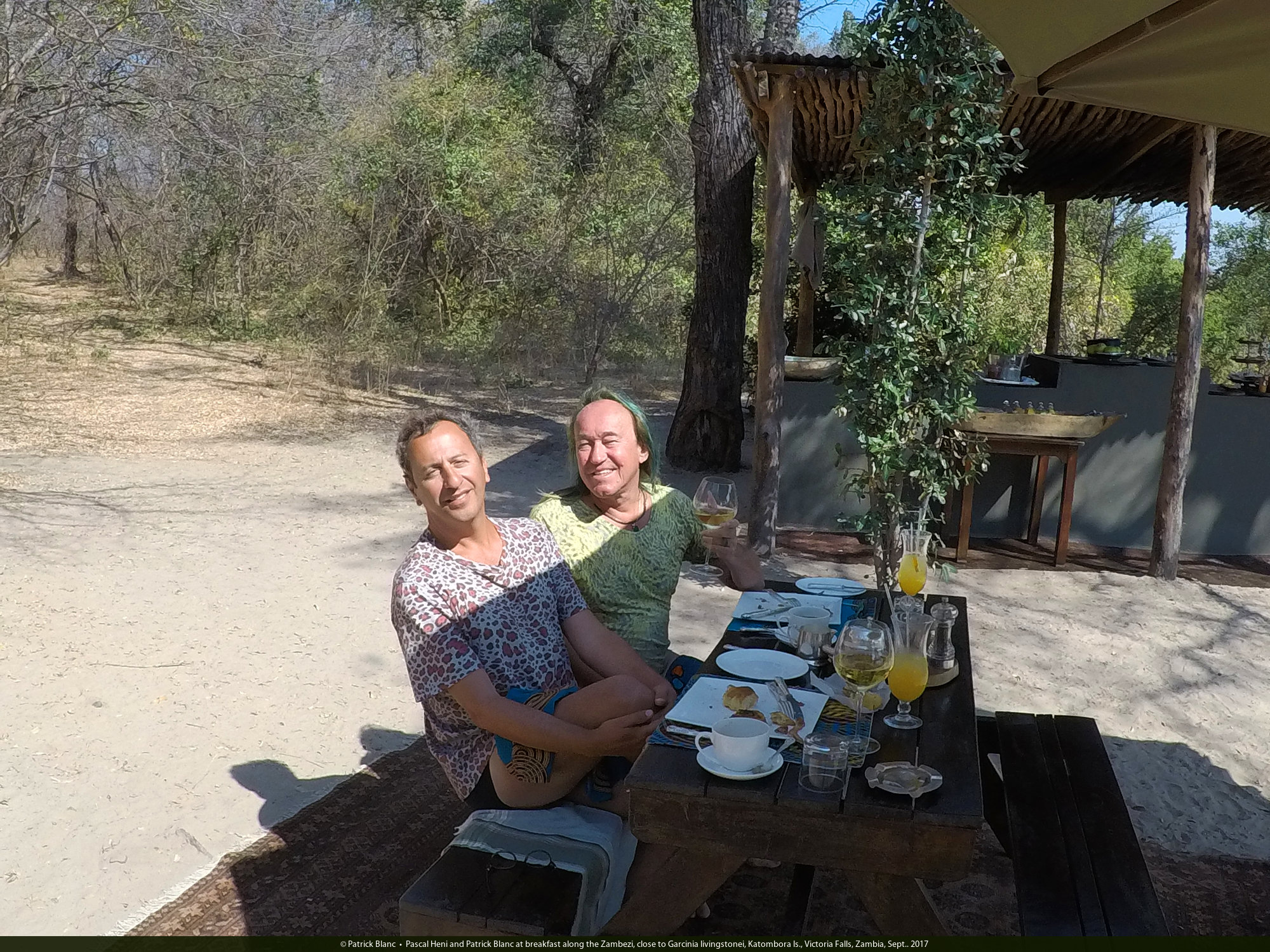 Pascal Heni and Patrick Blanc at breakfast along the Zambezi, close to Garcinia livingstonei, Katombora Is., Victoria Falls, Zambia, Sept.. 2017