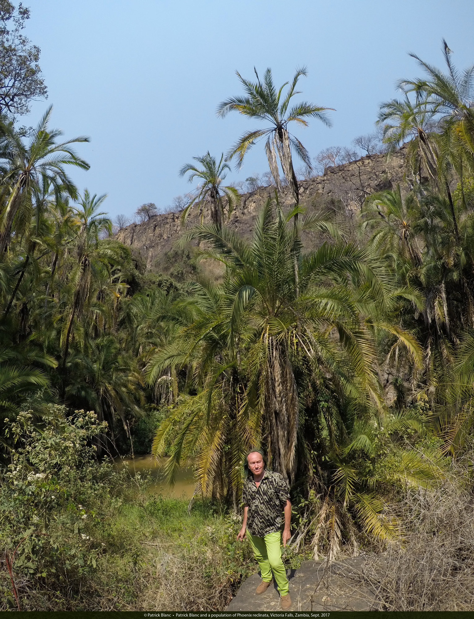 Patrick Blanc and a population of Phoenix reclinata, Victoria Falls, Zambia, Sept. 2017