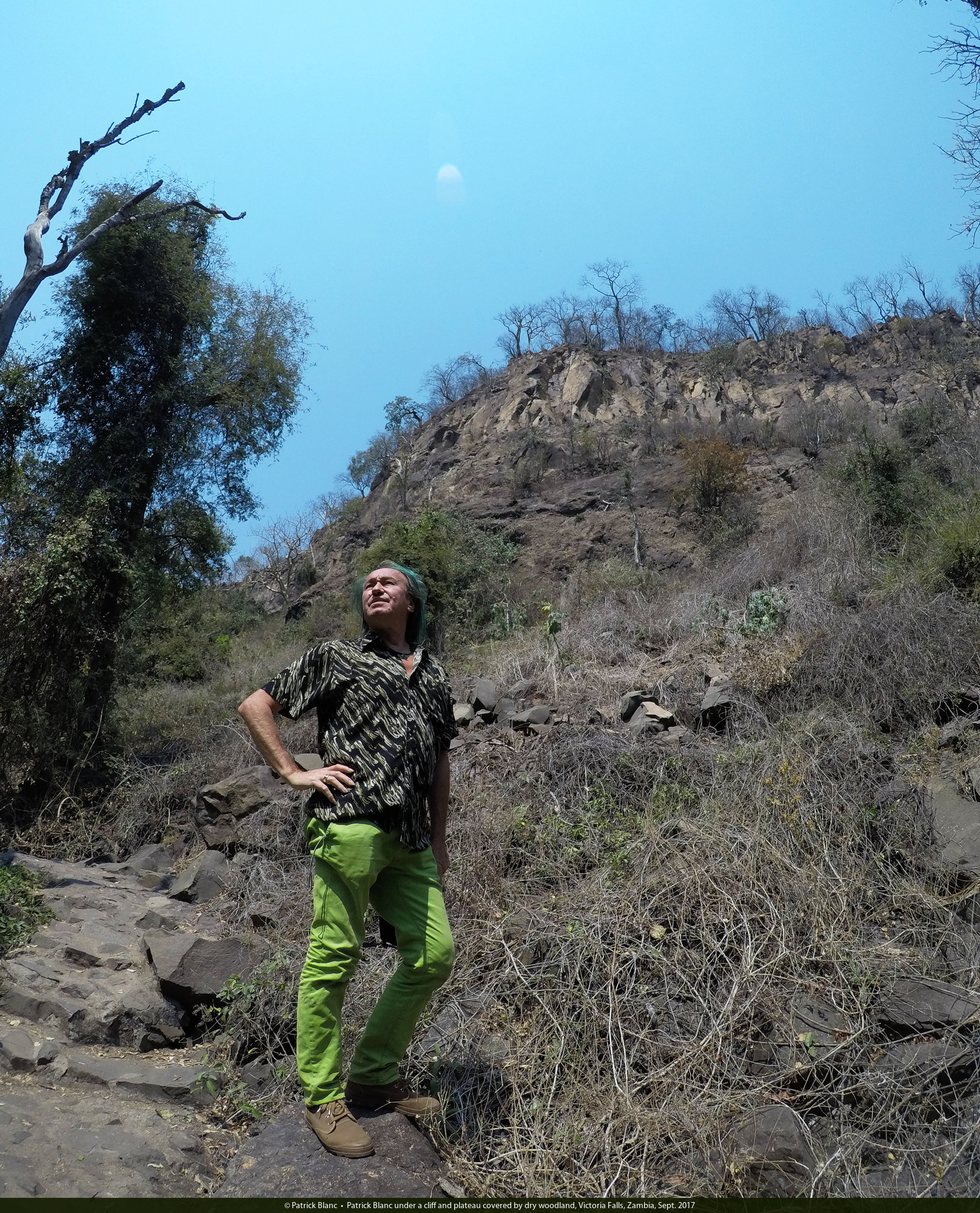Patrick Blanc under a cliff and plateau covered by dry woodland, Victoria Falls, Zambia, Sept. 2017