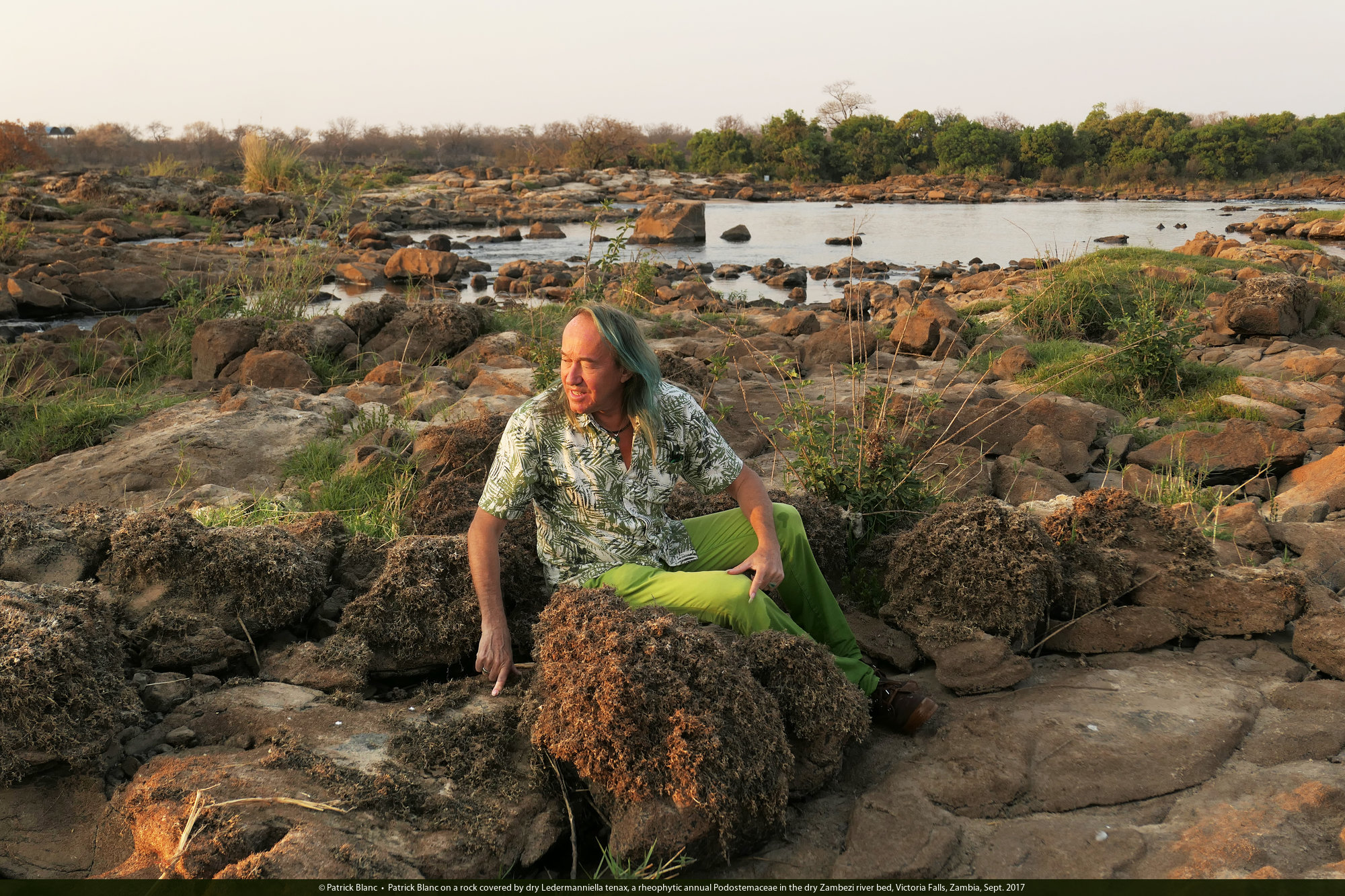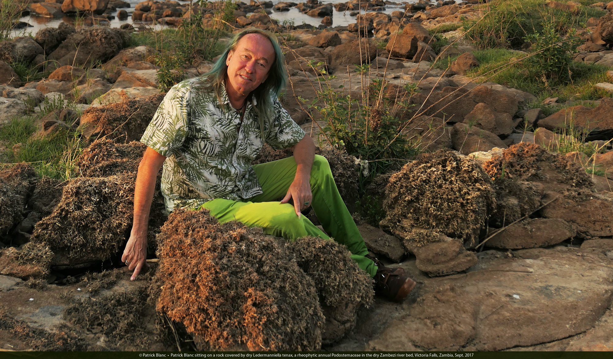 Patrick Blanc sitting on a rock covered by dry Ledermanniella tenax, a rheophytic annual Podostemaceae in the dry Zambezi river bed, Victoria Falls, Zambia, Sept. 2017