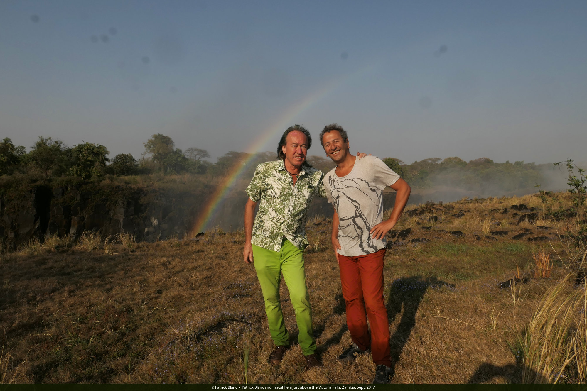 Patrick Blanc and Pascal Heni in front of the Victoria Falls, Zimbabwe, Sept. 2017