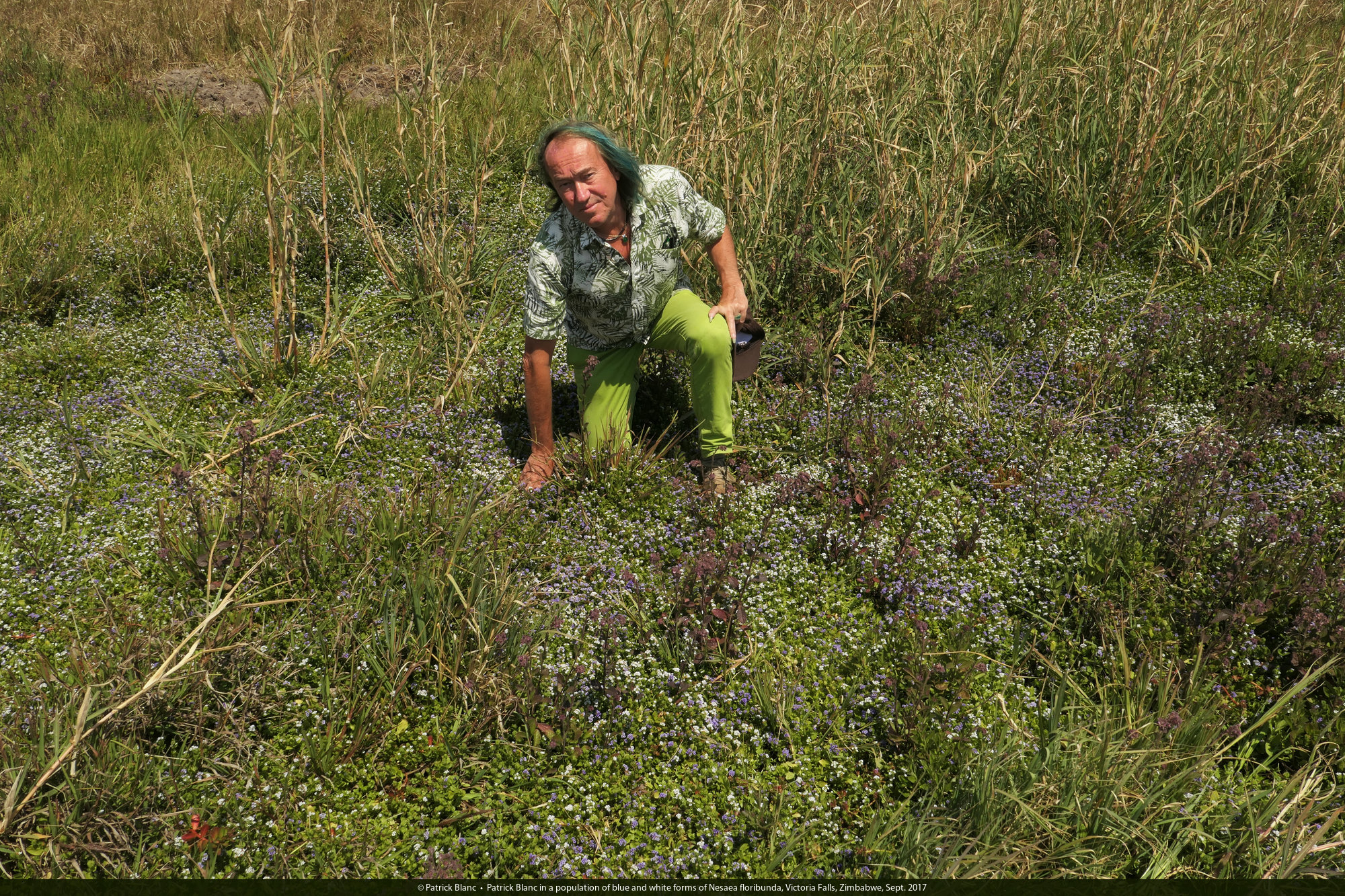Patrick Blanc in a population of blue and white forms of Nesaea floribunda, Victoria Falls, Zimbabwe, Sept. 2017