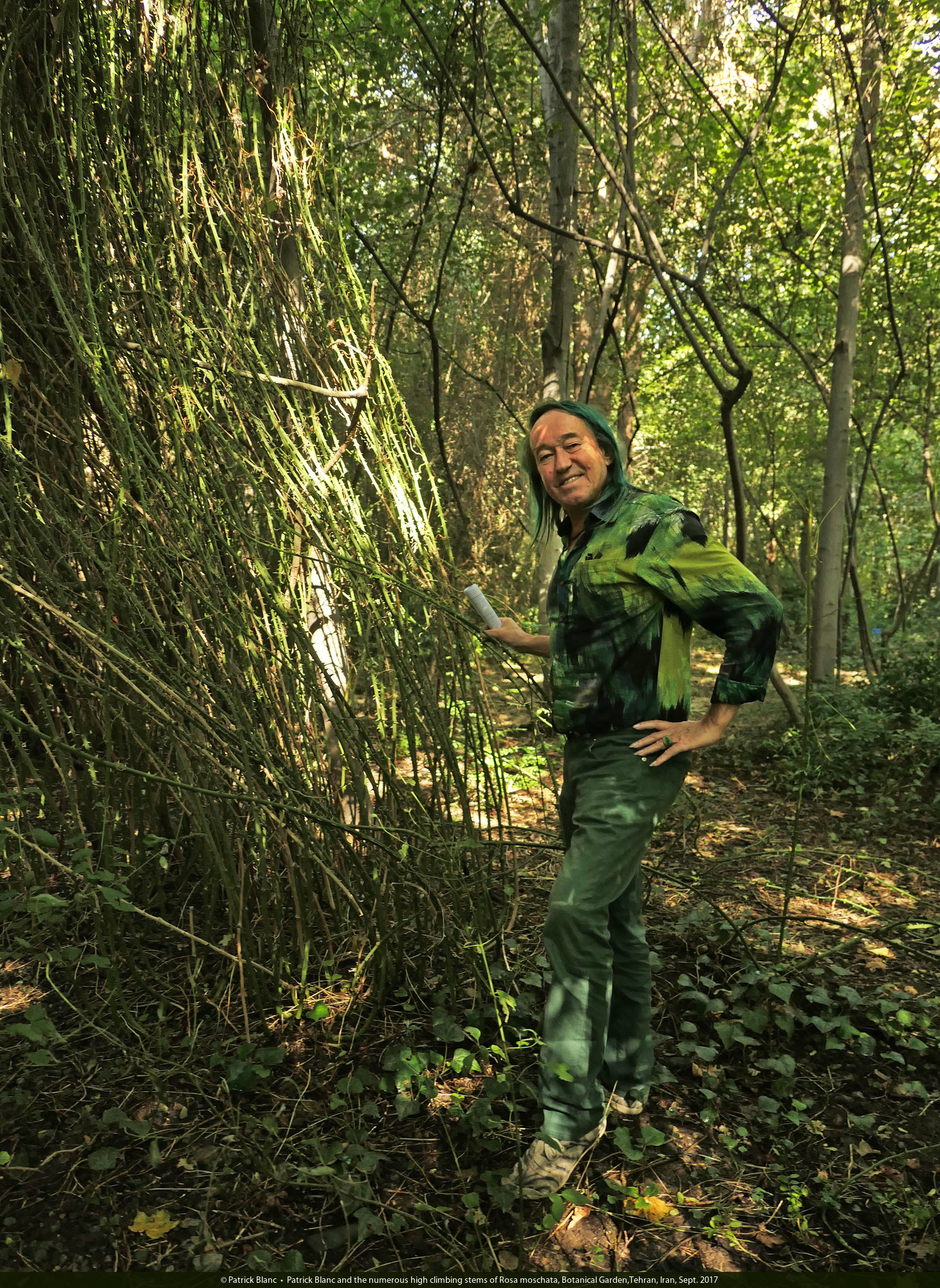 Patrick Blanc and the numerous high climbing stems of Rosa moschata, Botanical Garden,Tehran, Iran, Sept. 2017