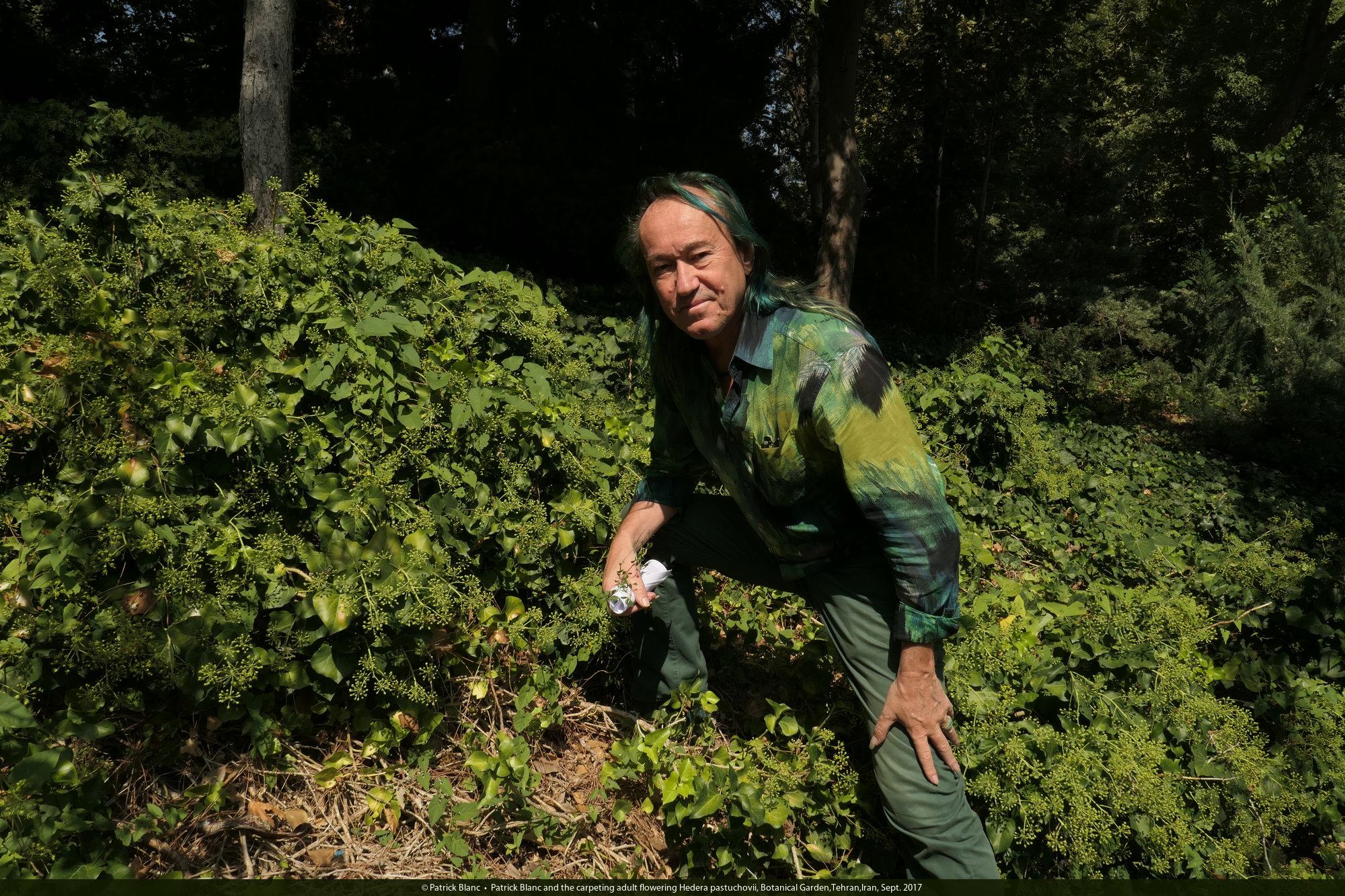 Patrick Blanc and the carpeting adult flowering Hedera pastuchovii, Botanical Garden,Tehran,Iran, Sept. 2017