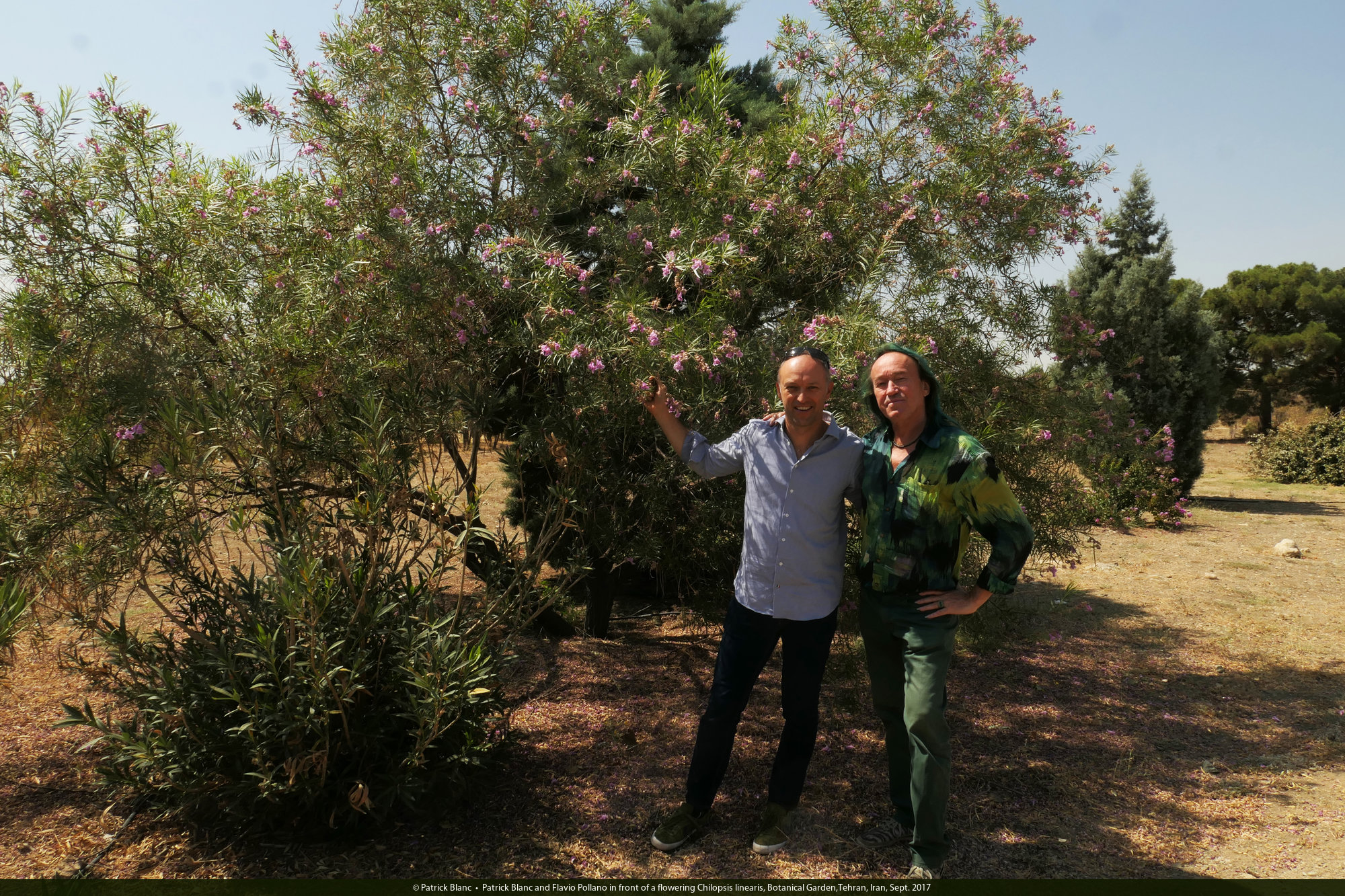 Patrick Blanc and Flavio Pollano in front of a flowering Chilopsis linearis, Botanical Garden,Tehran, Iran, Sept. 2017