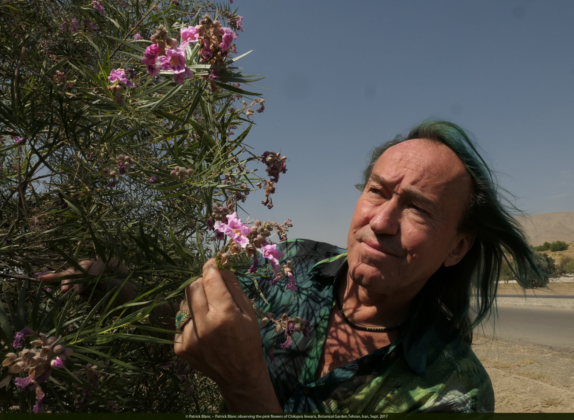 Patrick Blanc observing the pink flowers of Chilopsis linearis, Botanical Garden,Tehran, Iran, Sept. 2017