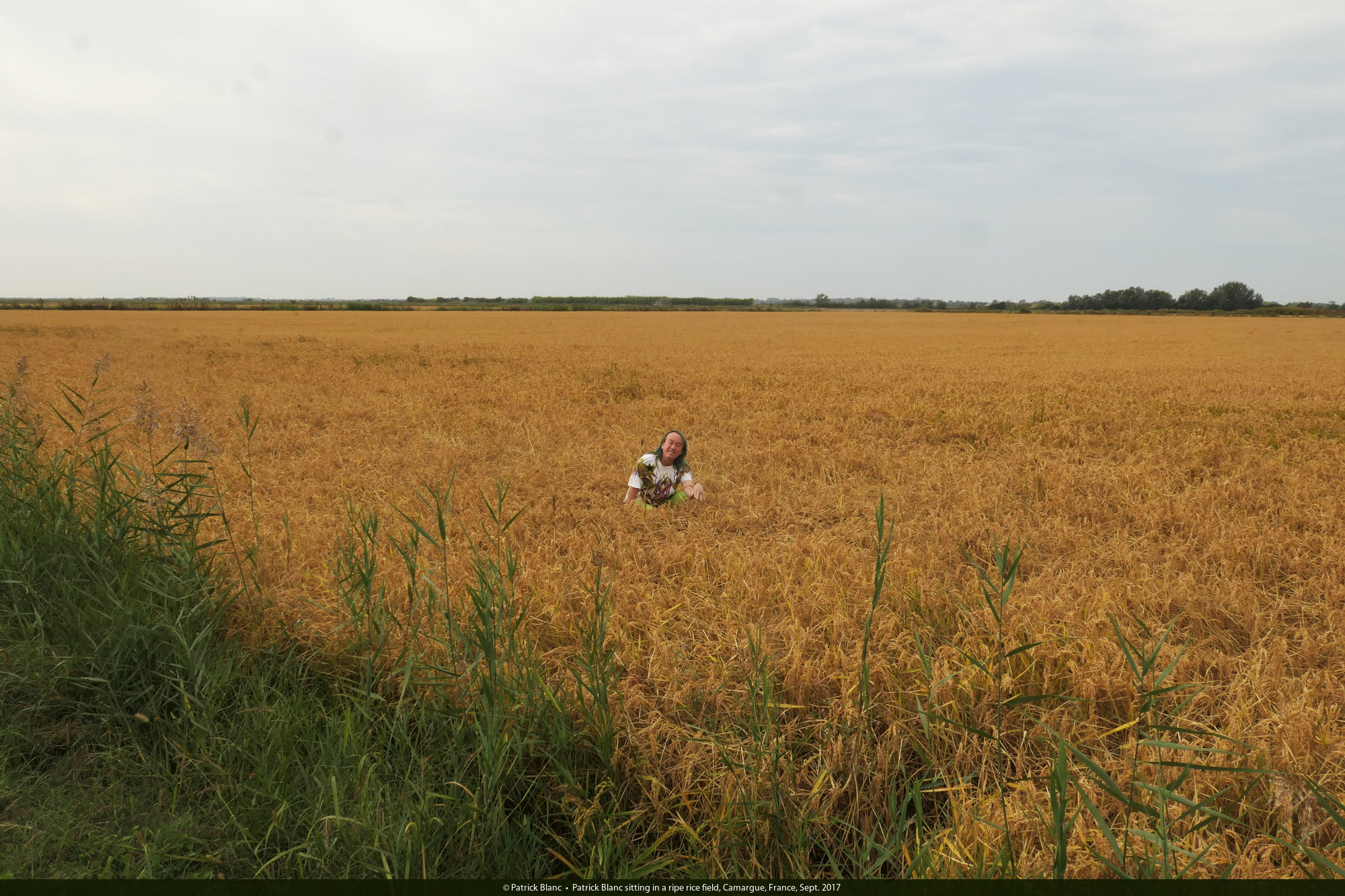 Patrick Blanc sitting in a ripe rice field, Camargue, France, Sept. 2017