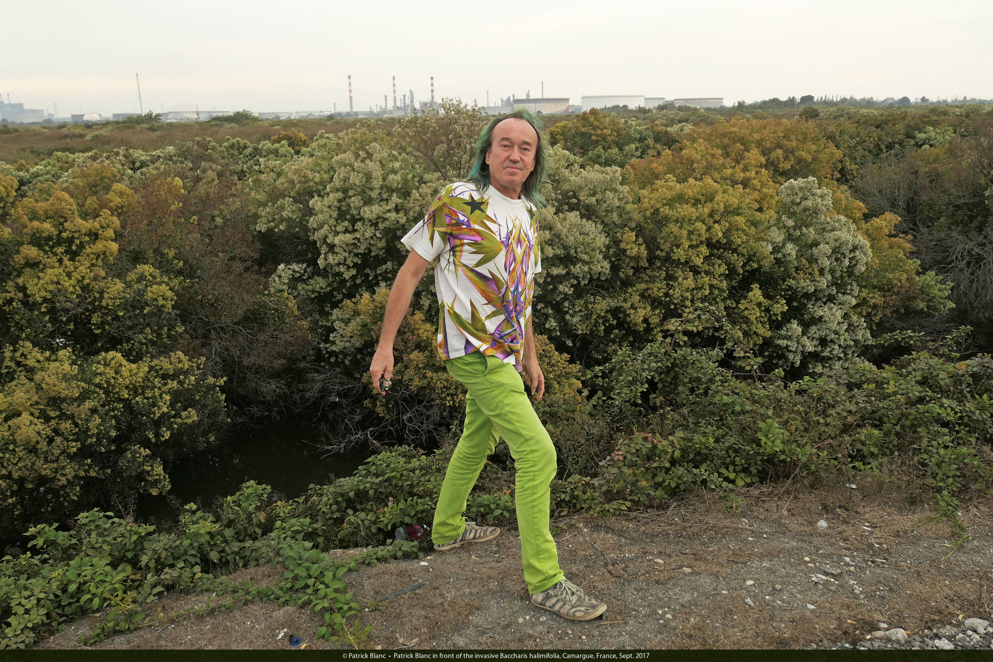 Patrick Blanc in front of the invasive Baccharis halimifolia, Camargue, France, Sept. 2017