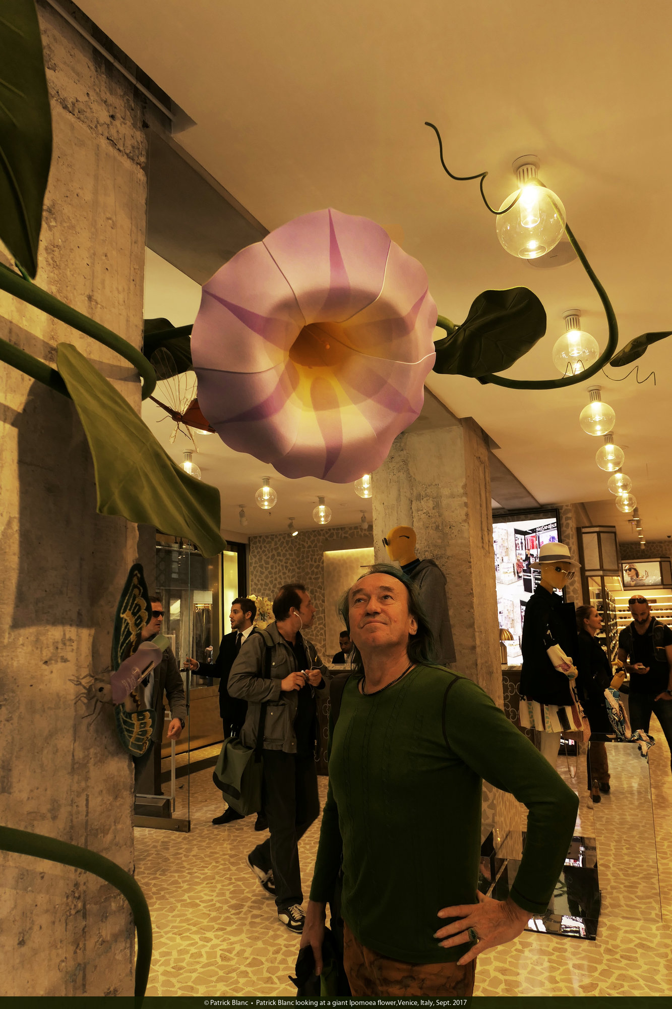 Patrick Blanc looking at a giant Ipomoea flower,Venice, Italy, Sept. 2017