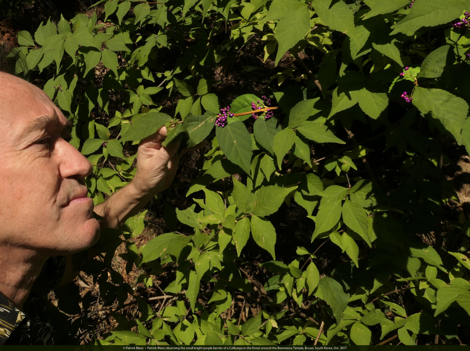 Patrick Blanc observing the small bright purple berries of a Callicarpa in the forest around the Beomeosa Temple, Busan, South Korea, Oct. 2017