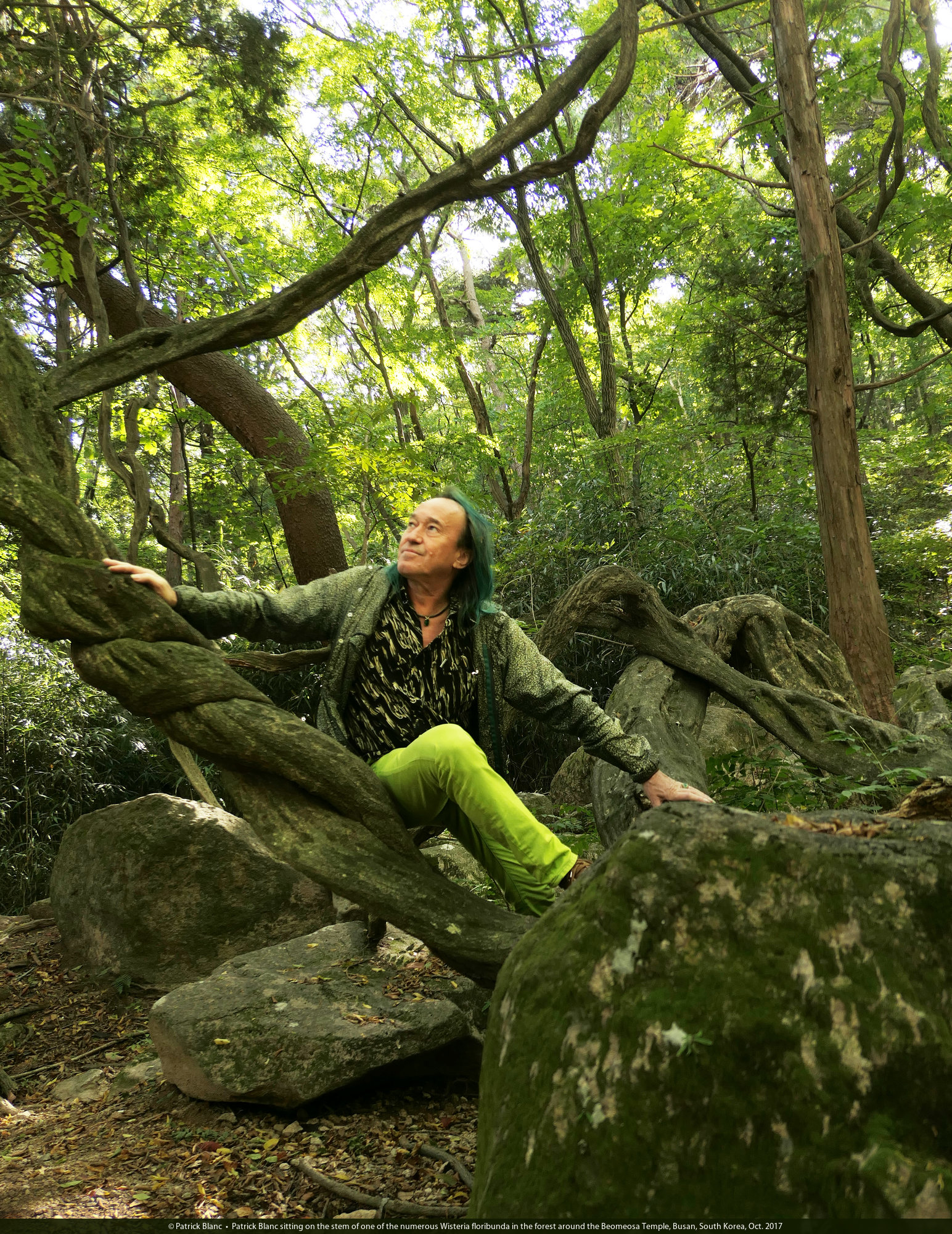 Patrick Blanc sitting on the stem of one of the numerous Wisteria floribunda in the forest around the Beomeosa Temple, Busan, South Korea, Oct. 2017