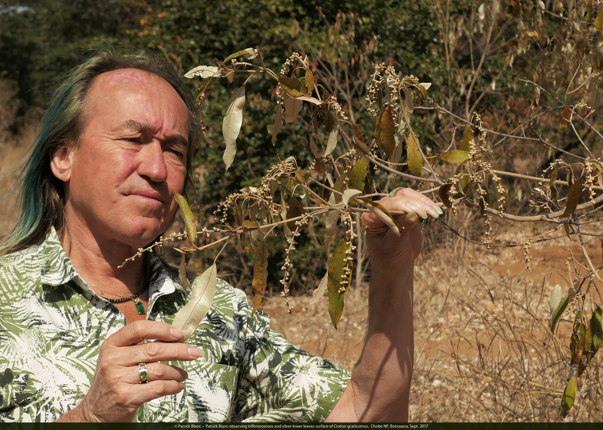 Patrick Blanc observing inflorescences and silver lower leaves surface of Croton gratissimus, Chobe NP, Botswana, Sept. 2017