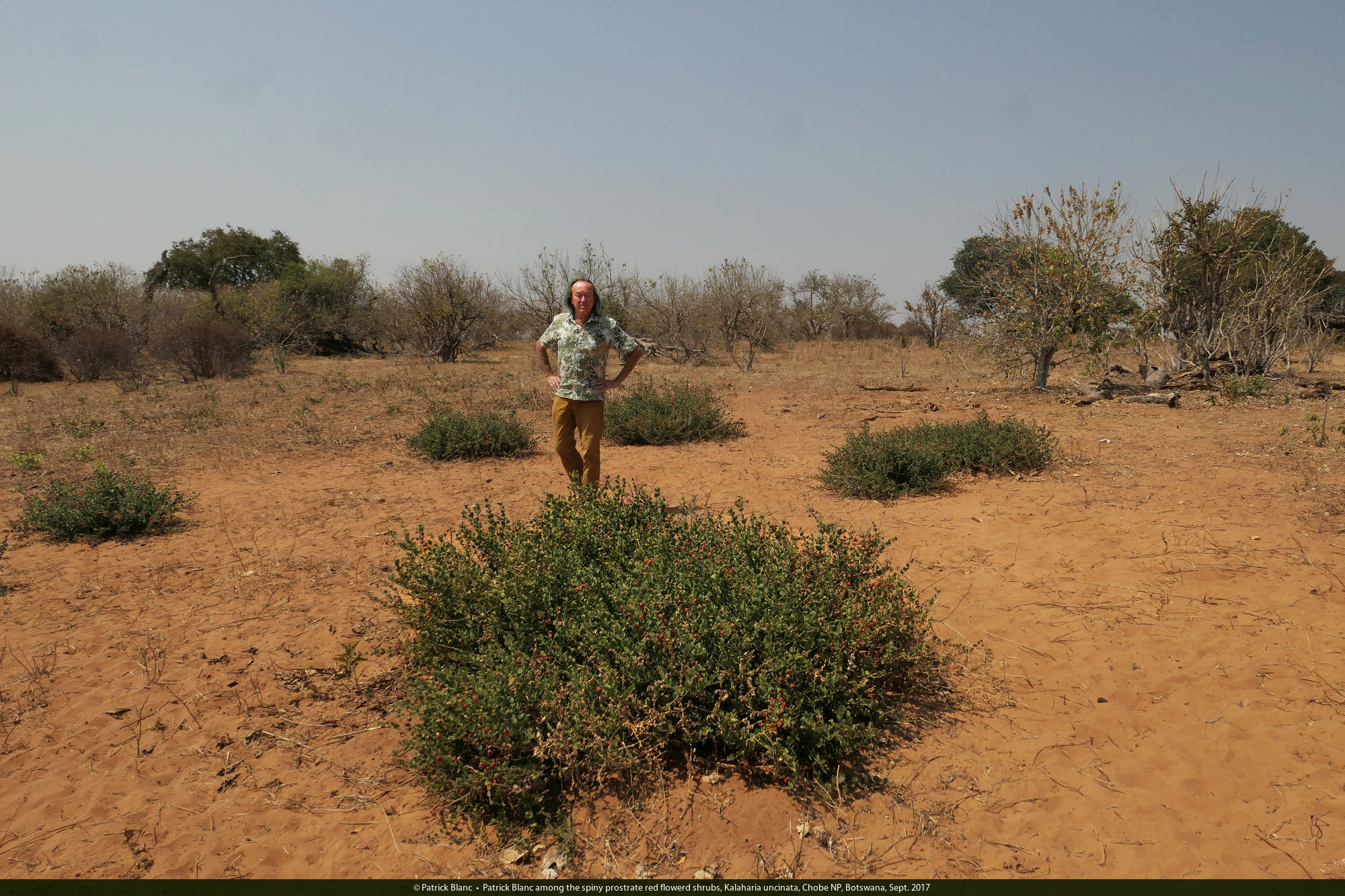 Patrick Blanc among the spiny prostrate red flowerd shrubs, Kalaharia uncinata, Chobe NP, Botswana, Sept. 2017