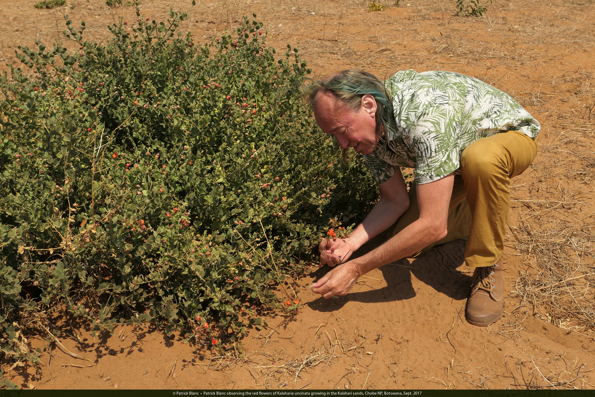 Patrick Blanc observing the red flowers of Kalaharia uncinata growing in the Kalahari sands, Chobe NP, Botswana, Sept. 2017