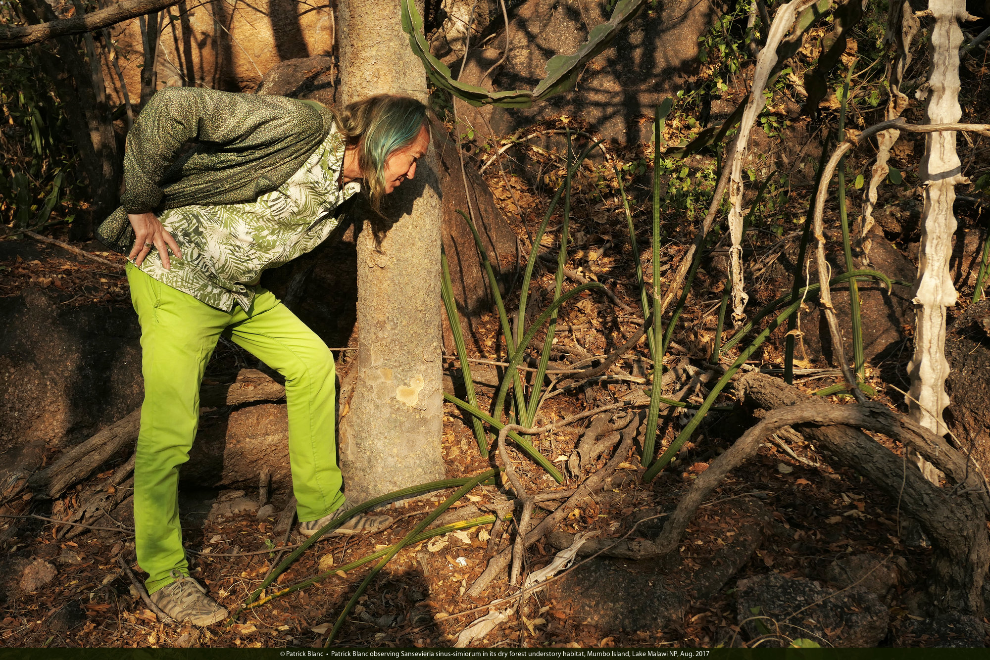 Patrick Blanc observing Sansevieria sinus-simiorum in its dry forest understory habitat, Mumbo Island, Lake Malawi NP, Aug. 2017