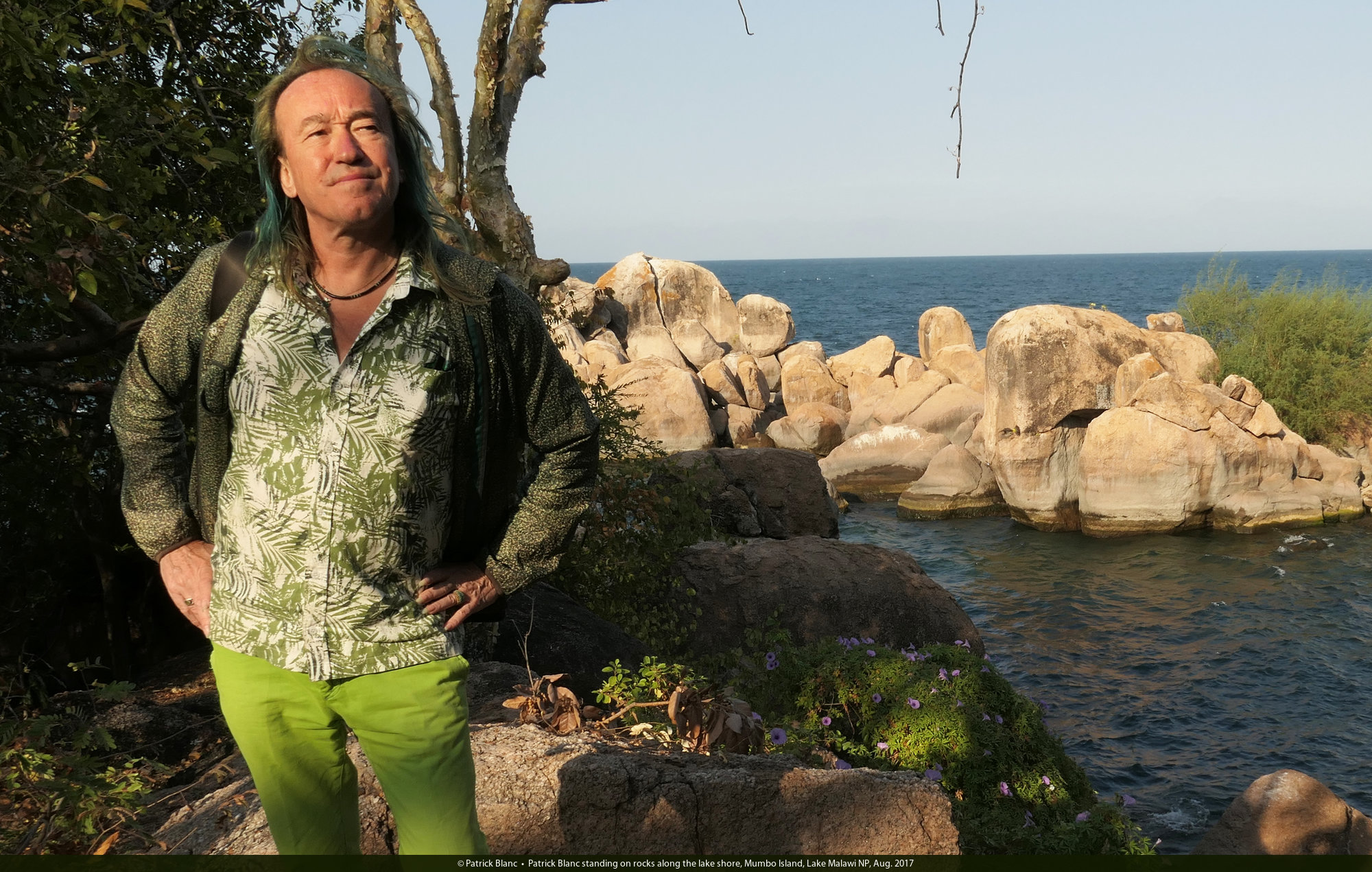 Patrick Blanc standing on rocks along the lake shore, Mumbo Island, Lake Malawi NP, Aug. 2017