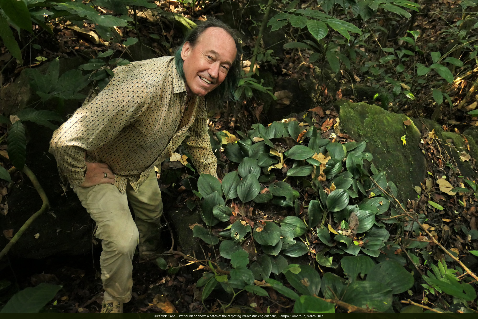Patrick Blanc above a patch of the carpeting Paracostus englerianus, Campo, Cameroun, March 2017
