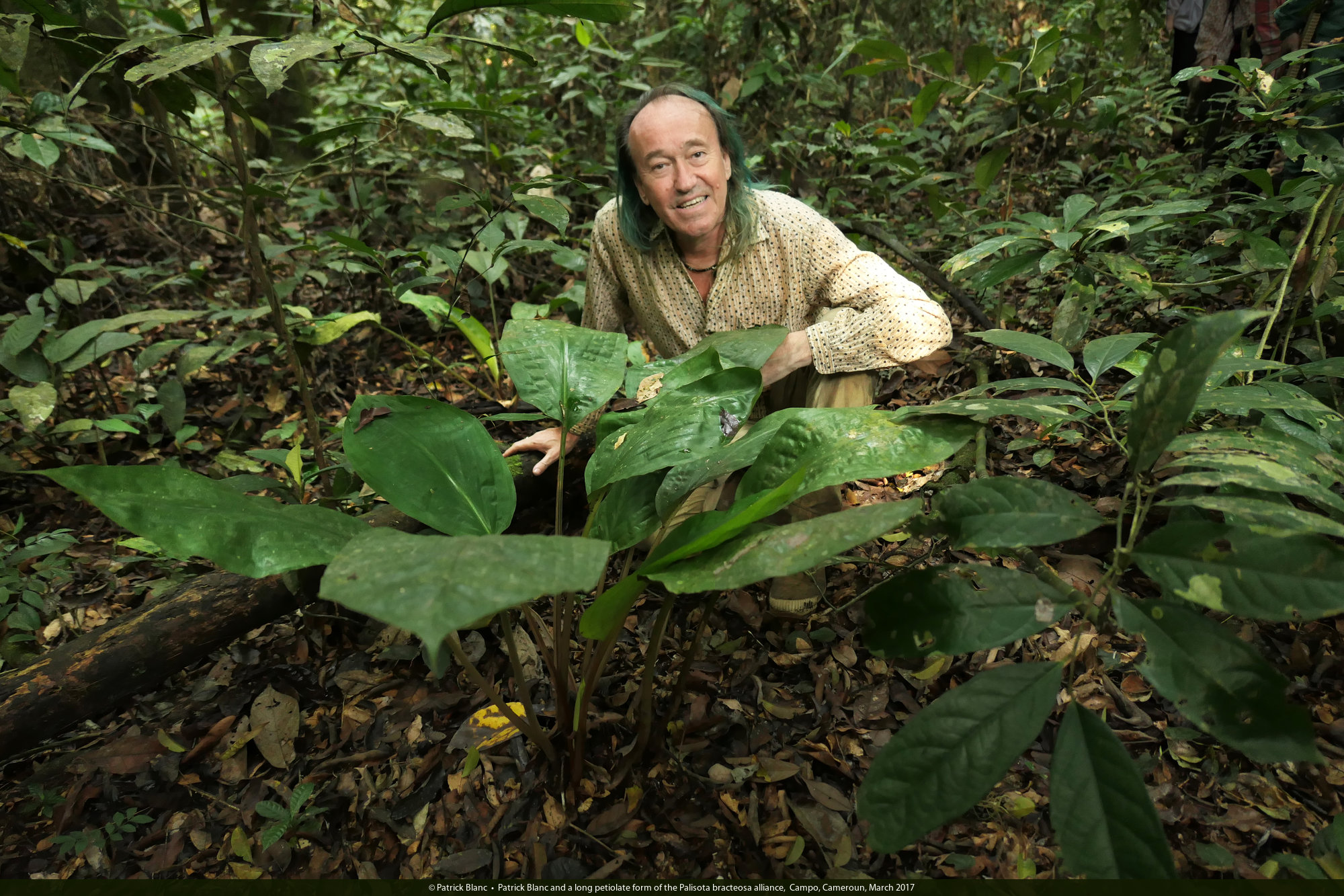 Patrick Blanc and a long petiolate form of the Palisota bracteosa alliance, Campo, Cameroun, March 2017