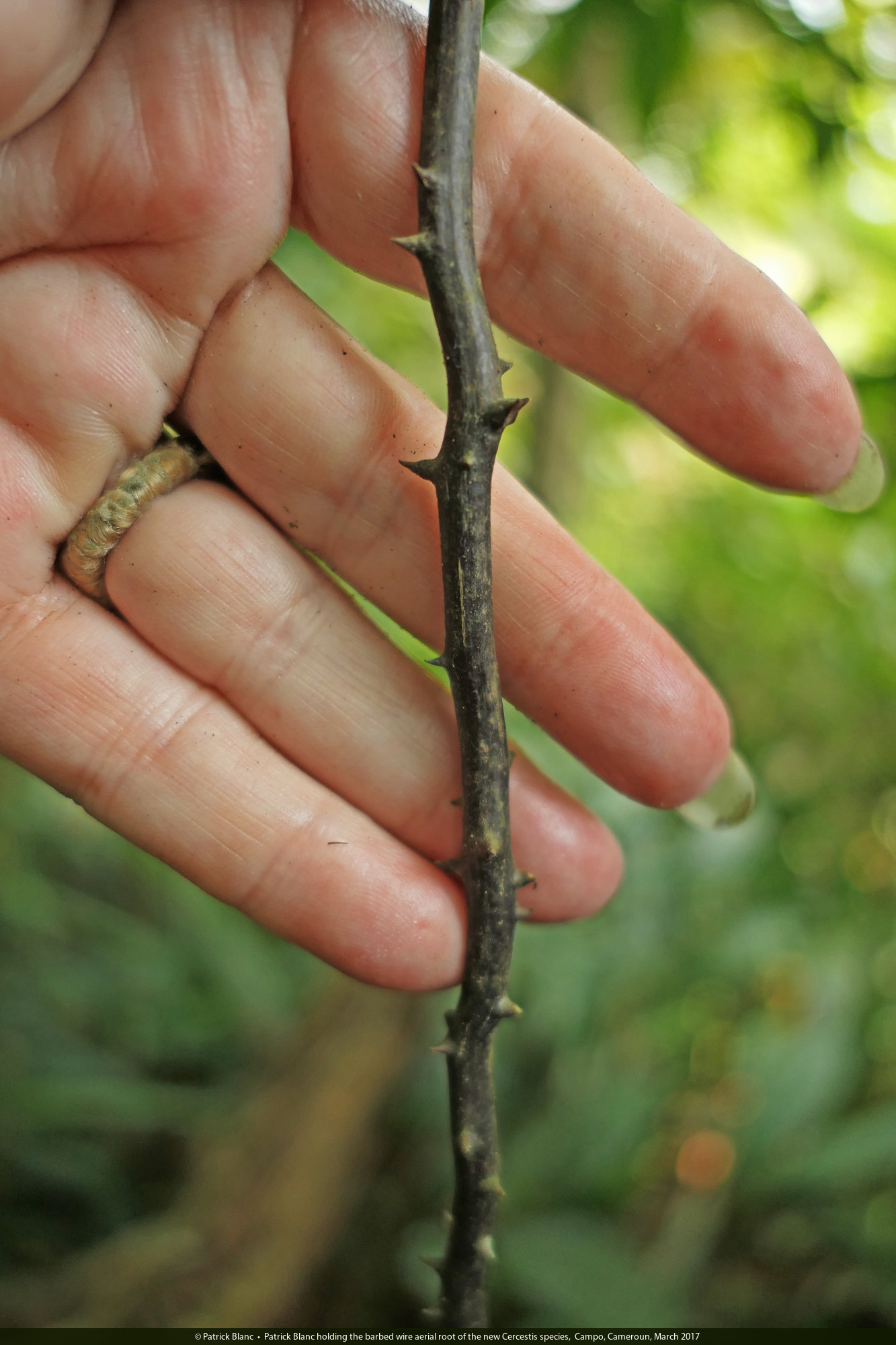 Patrick Blanc holding the barbed wire aerial root of the new Cercestis species, Campo, Cameroun, March 2017