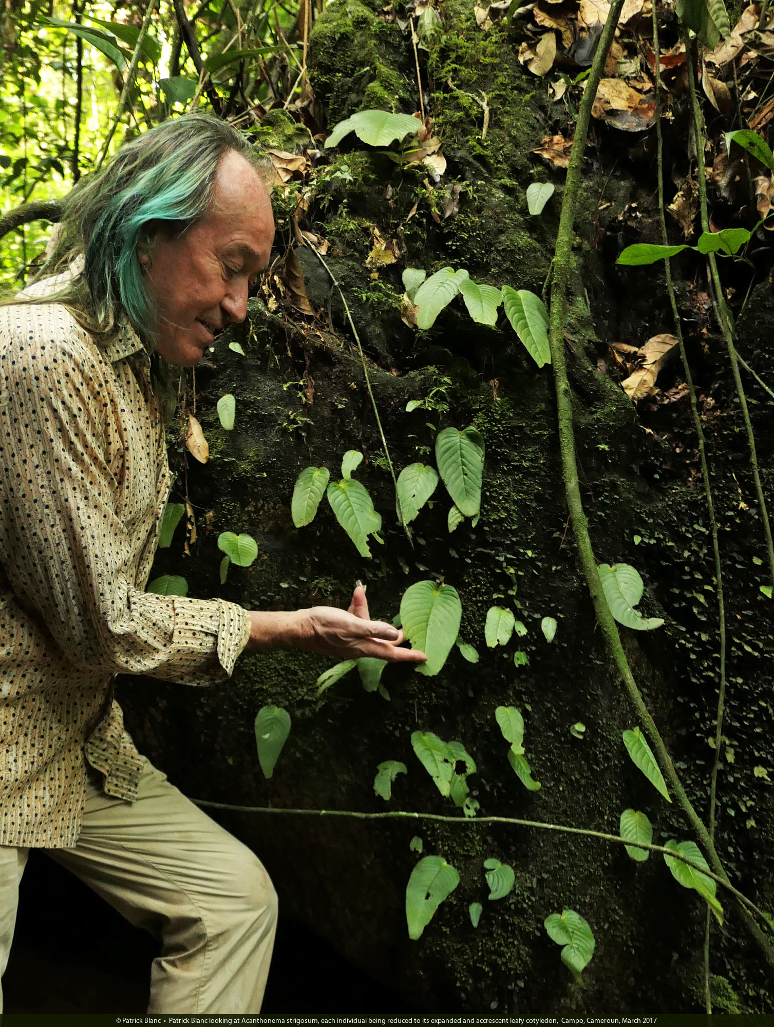 Patrick Blanc looking at Acanthonema strigosum, each individual being reduced to its expanded and accrescent leafy cotyledon, Campo, Cameroun, March 2017