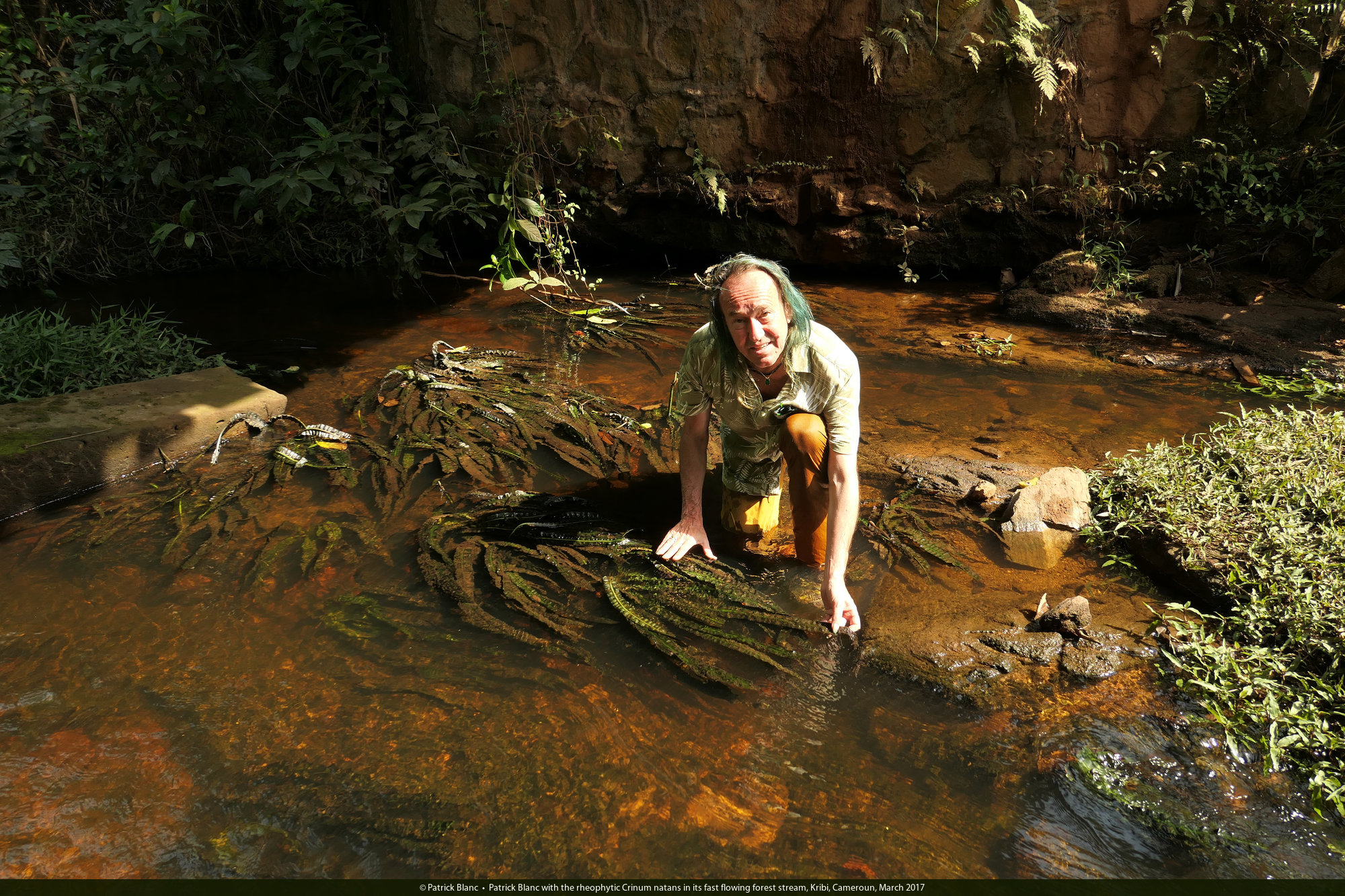 Patrick Blanc with the rheophytic Crinum natans in its fast flowing forest stream, Kribi, Cameroun, March 2017