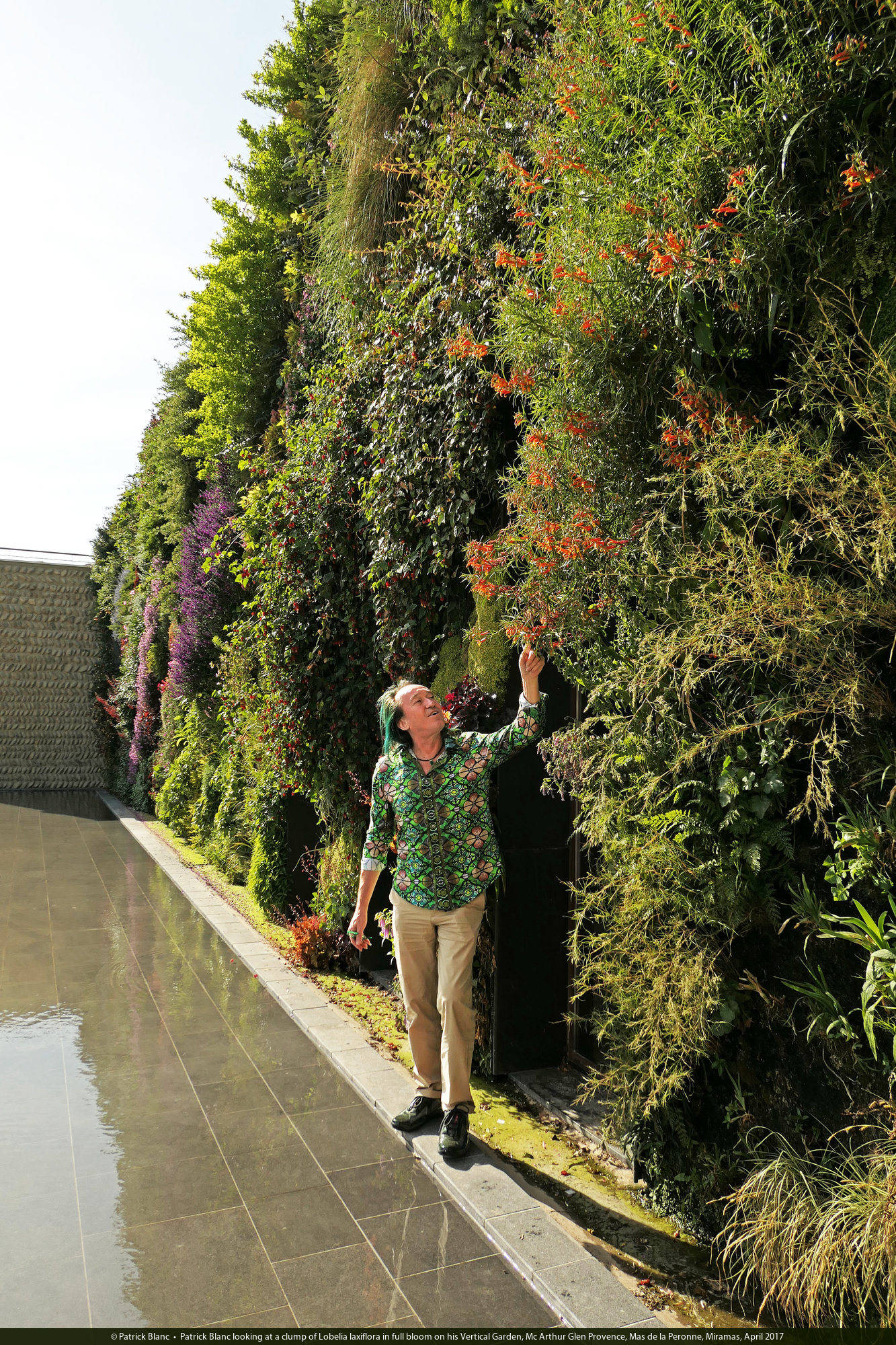 Patrick Blanc looking at a clump of Lobelia laxiflora in full bloom on his Vertical Garden, Mc Arthur Glen Provence, Mas de la Peronne, Miramas, April 2017
