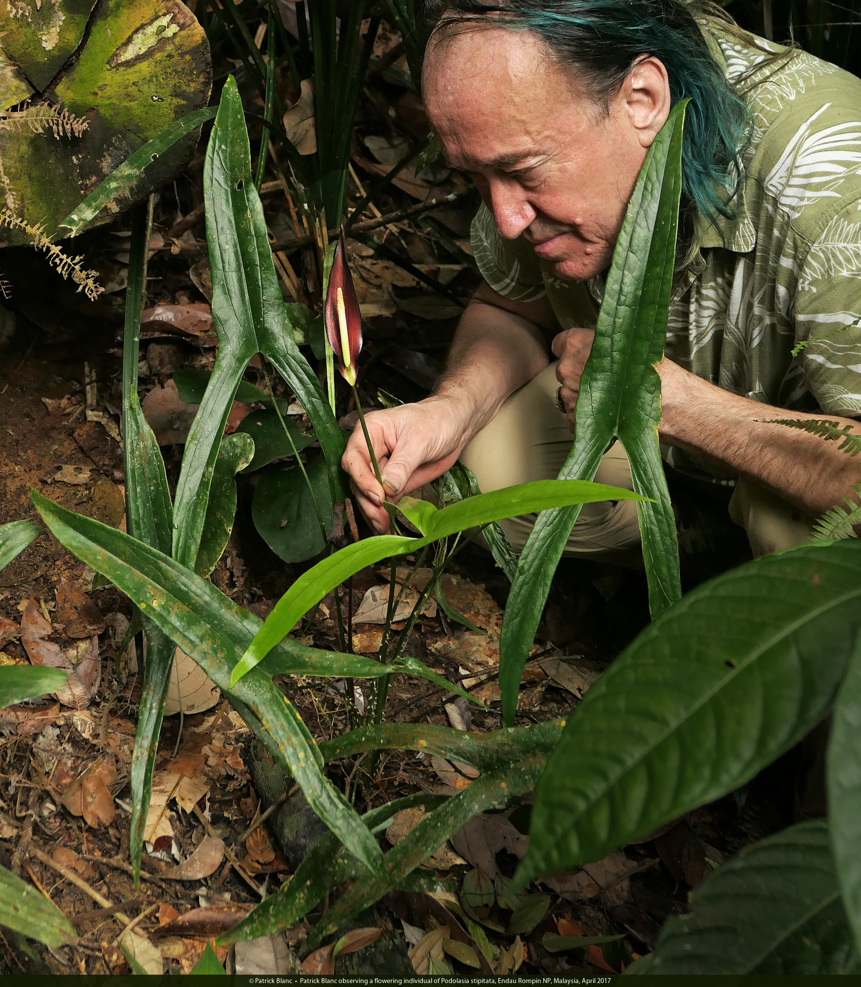 Patrick Blanc observing a flowering individual of Podolasia stipitata, Endau Rompin NP, Malaysia, April 2017