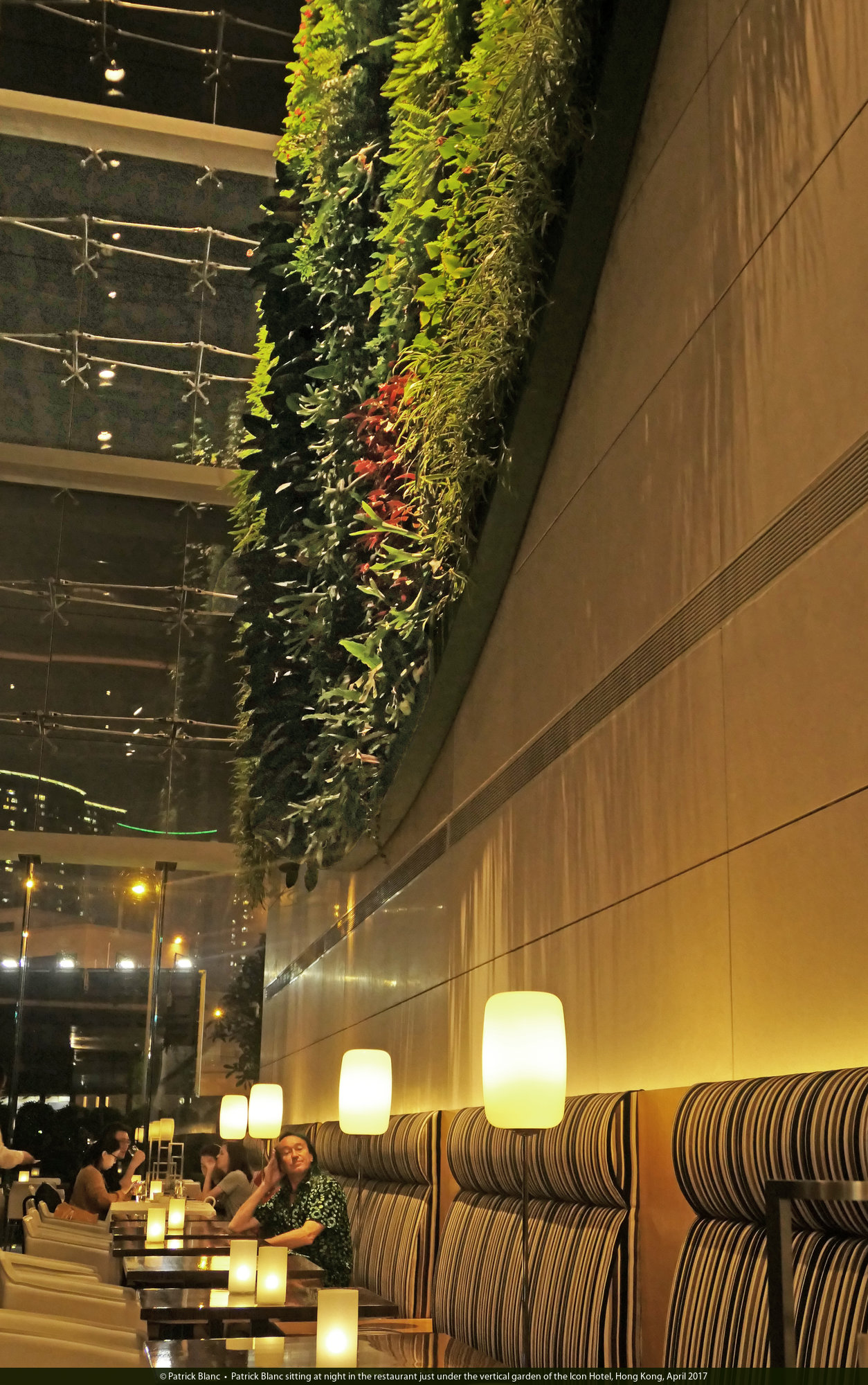Patrick Blanc sitting at night in the restaurant just under the vertical garden of the Icon Hotel, Hong Kong, April 2017