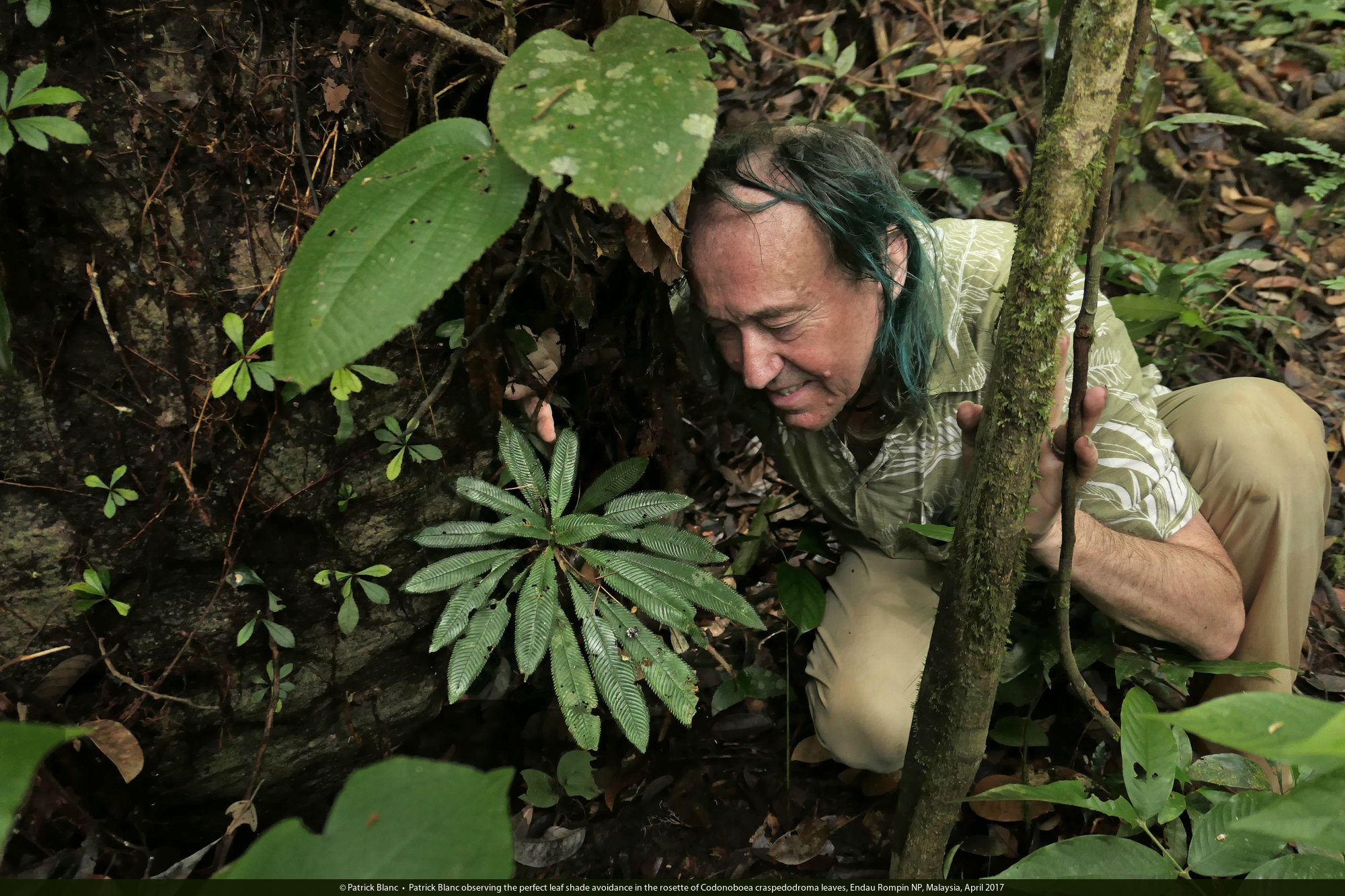 Patrick Blanc observing the perfect leaf shade avoidance in the rosette of Codonoboea craspedodroma leaves, Endau Rompin NP, Malaysia, April 2017