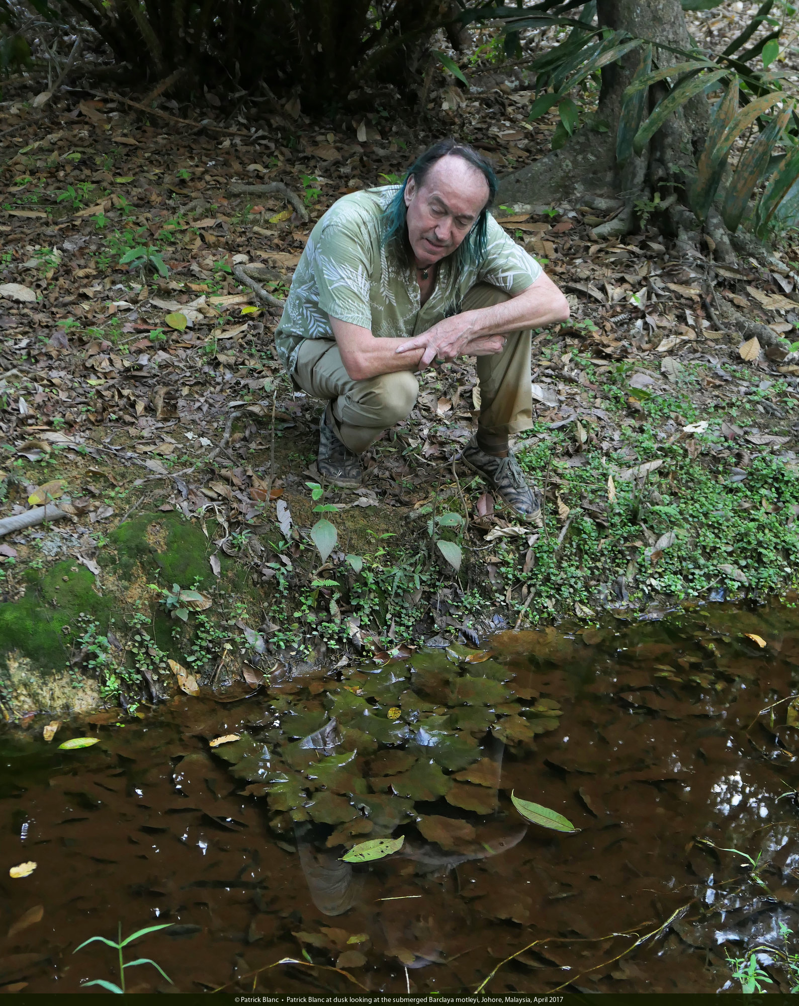 Patrick Blanc at dusk looking at the submerged Barclaya motleyi, Johore, Malaysia, April 2017