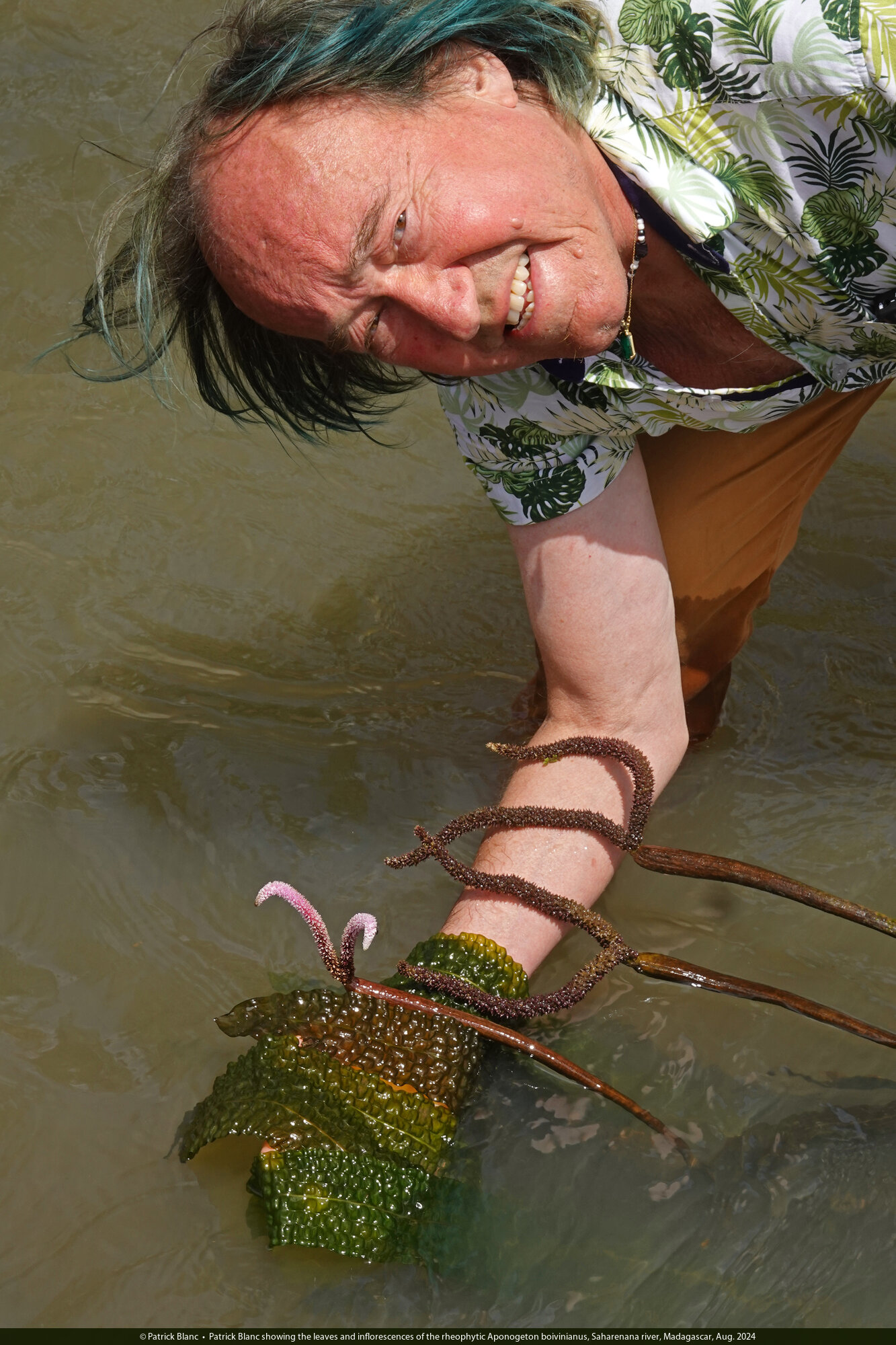 Patrick Blanc showing the leaves and inflorescences of the rheophytic Aponogeton boivinianus, Saharenana river, Madagascar, Aug. 2024