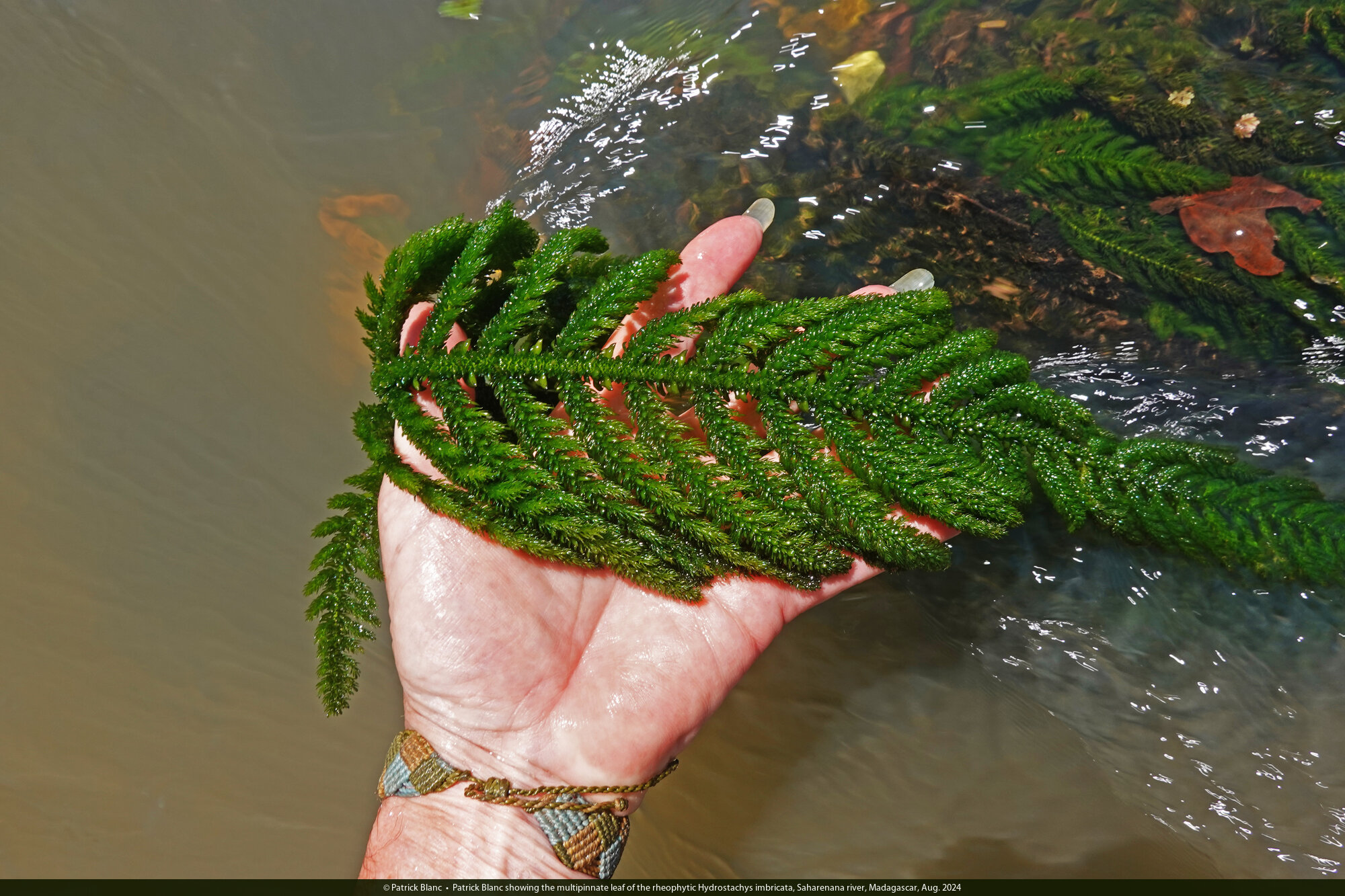 Patrick Blanc showing the multipinnate leaf of the rheophytic Hydrostachys imbricata, Saharenana river, Madagascar, Aug. 2024